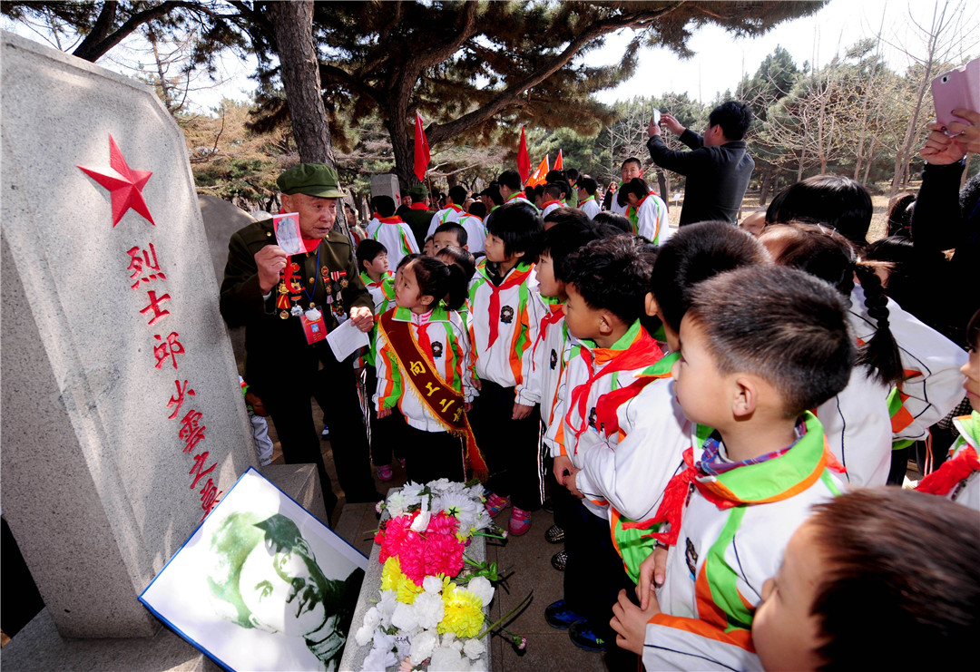 在沈陽抗美援朝烈士陵園,志愿軍老戰士向學生們講述邱少云的英雄事跡。張文魁 攝