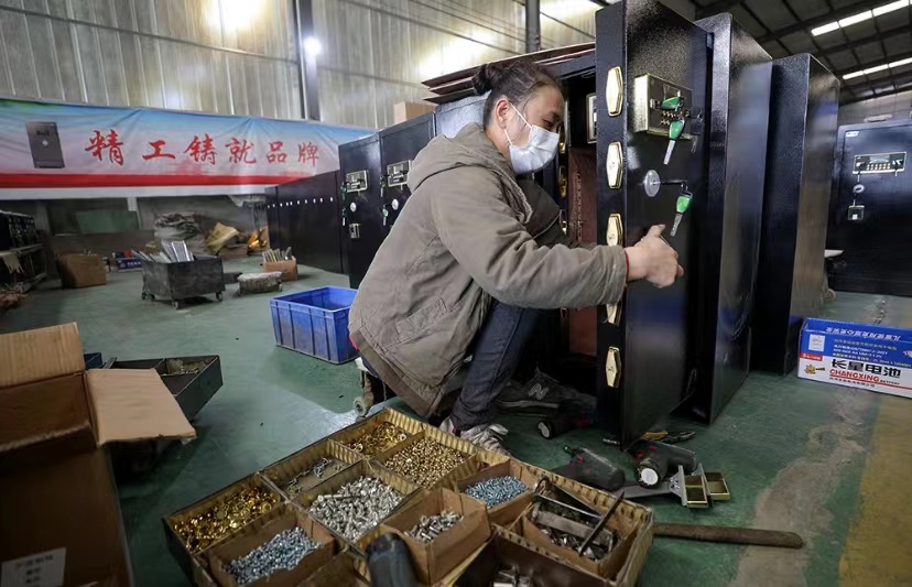 切割、焊接、噴涂、組裝……日前,在河北虎牌集團奧笛柜業(yè)公司生產(chǎn)車間內(nèi),一臺臺自動化設(shè)備高效運轉(zhuǎn),一個個高端智能控制系統(tǒng)保險柜產(chǎn)品不斷下線。車間外,一輛輛貨車已滿載打好包裝的保險柜,即將發(fā)往全國各地。