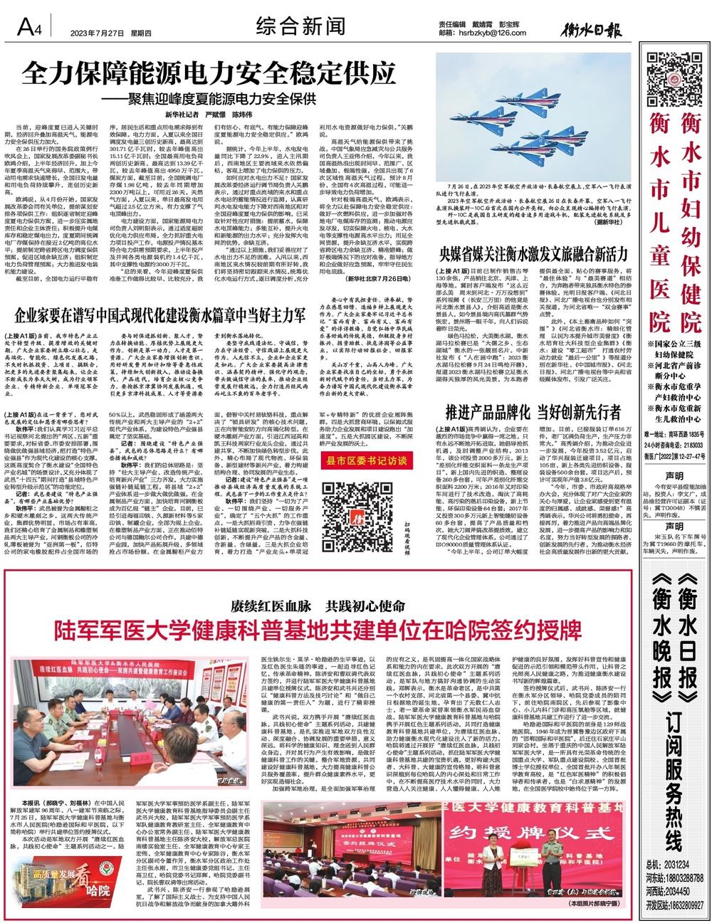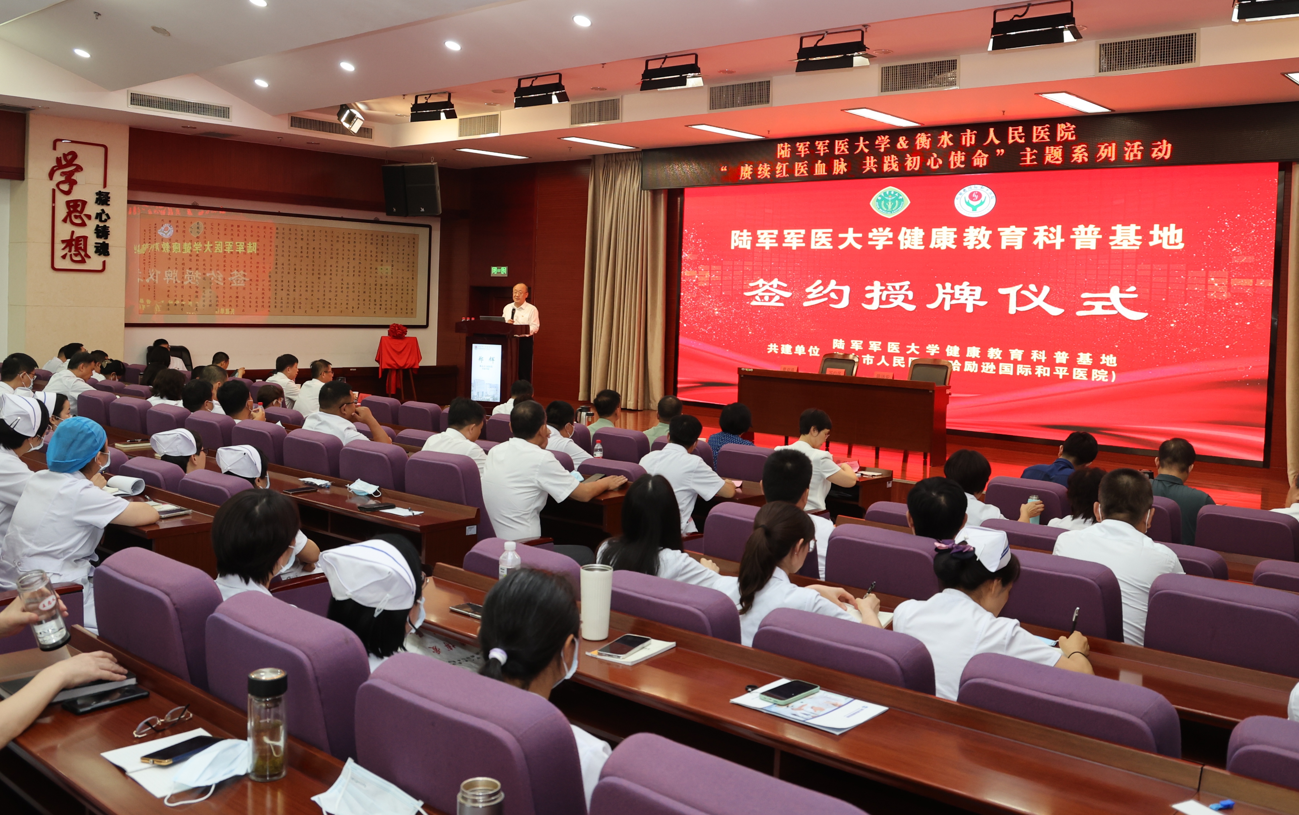 賡續(xù)紅醫(yī)血脈 ,共踐初心使命。在中國人民解放軍建軍96周年、八一建軍節(jié)來臨之際,7月25日,陸軍軍醫(yī)大學健康科普基地與衡水市人民醫(yī)院(哈勵遜國際和平醫(yī)院)舉行共建單位簽約授牌儀式。