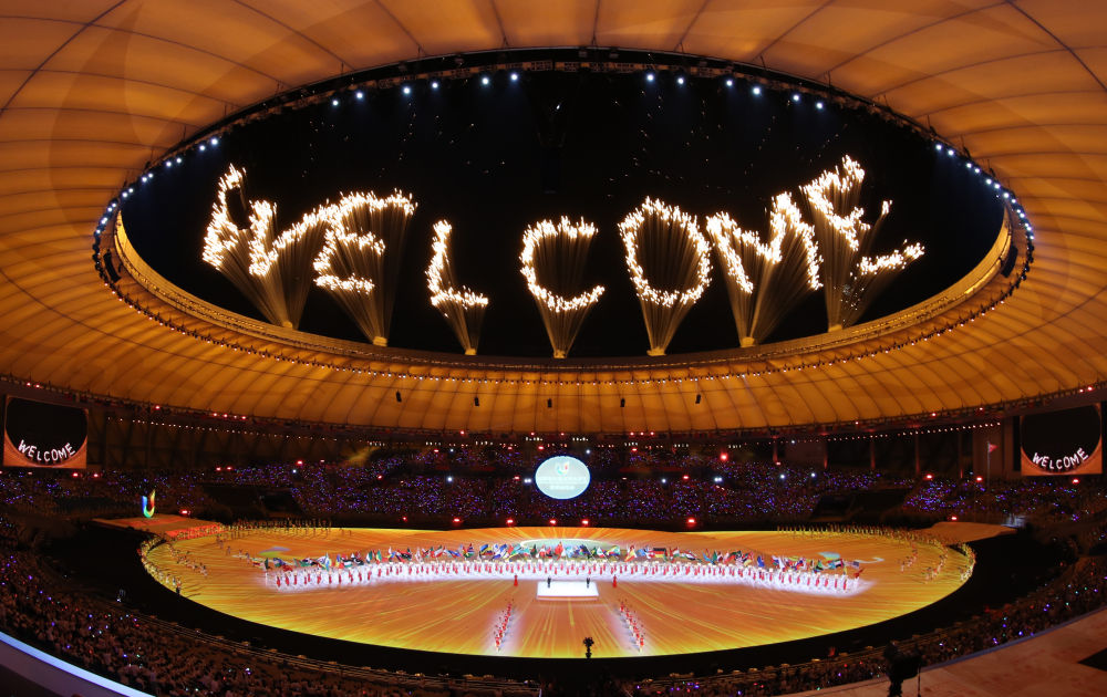 在主題曲《成就夢想》歌聲中,道道金色光芒灑向地面,代表參賽國家和地區的旗幟匯聚于場地中央,寓意地球村的居民們沐浴在同一片陽光之下,以包容的胸懷構建和而不同的精神家園。