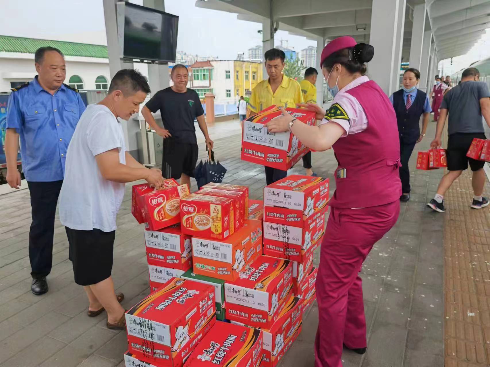 “劉站長,可謝謝你們啦,這些物資真解了我燃眉之急啊!”7月31日中午12時30分左右,Z386次列車長指著搬運上車的方便面、礦泉水,向肅寧站站長劉英路道謝。