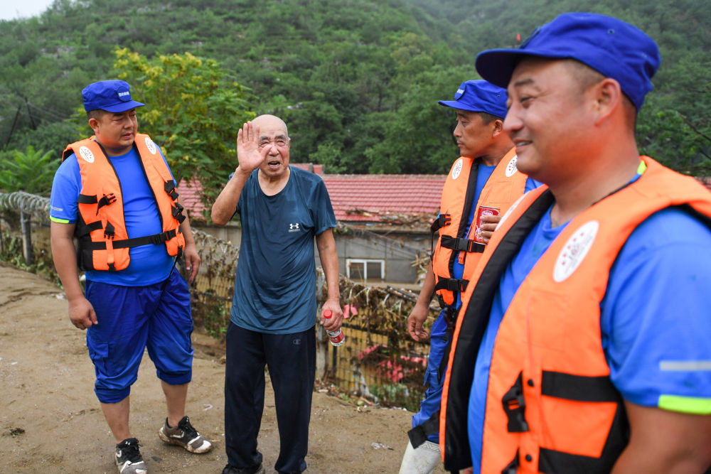 8月1日,在北京市門頭溝區水峪嘴村,一名87歲的村民向助他脫困的河北秦皇島獵豹救援隊隊員表示感謝。新華社記者 鞠煥宗 攝