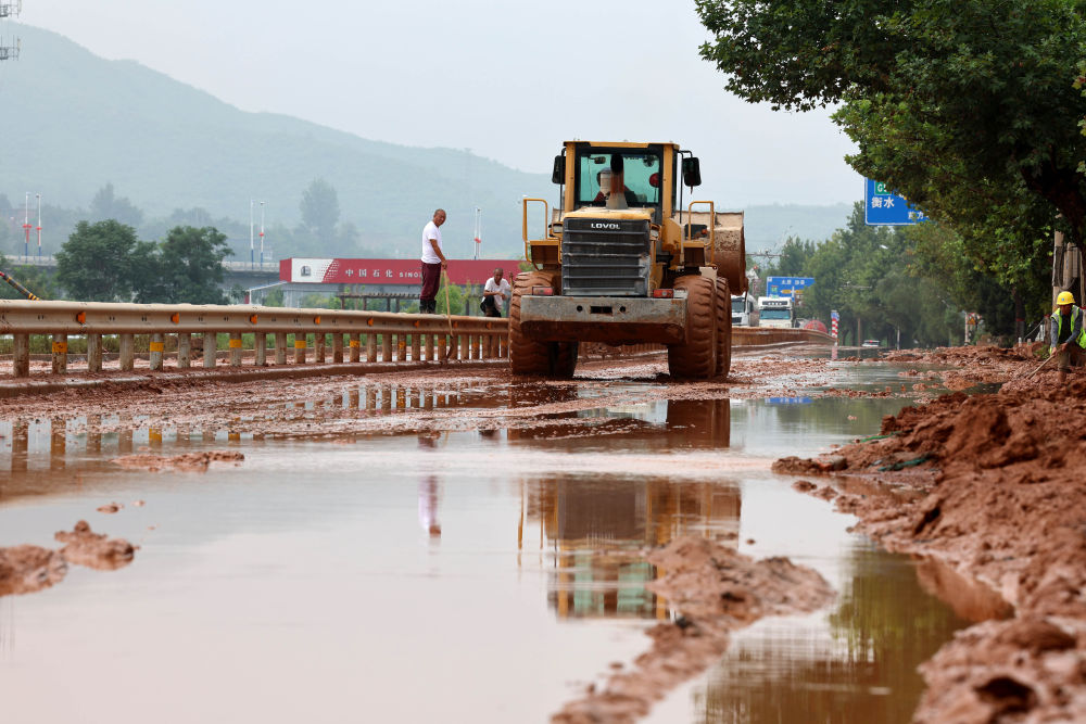 7月31日,在河北省石家莊市井陘縣307國道長崗村段,防汛工作人員駕駛機械清理淤泥。新華社發(梁子棟攝)