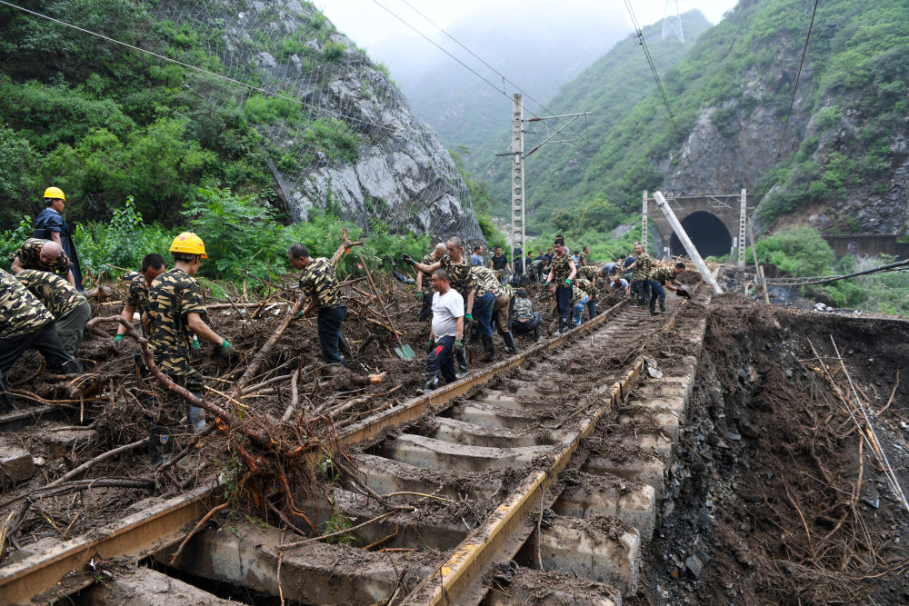 8月1日,在北京市門頭溝區水峪嘴村附近一段被阻斷的鐵路線上,中鐵六局的工作人員在清理軌道上的雜物,全力恢復交通。新華社記者 鞠煥宗 攝