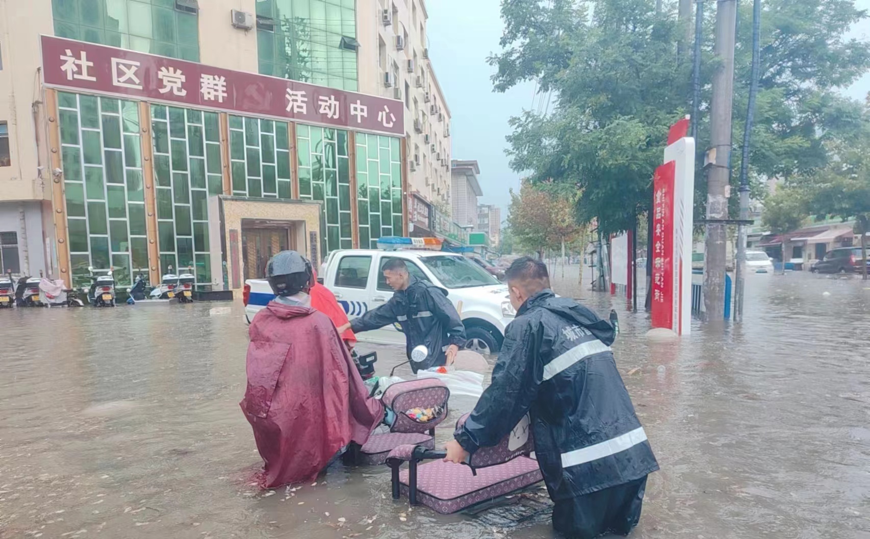 早6點30分開始,各組執法人員在各自責任區開展巡查、排撈工作,及時打開井蓋、雨水篦子加快排水,使用鐵鍬、筐、漏勺、耙子、掃帚及時清理退水路面積泥和漂浮垃圾,確保責任路段無長時間大面積積水;同時安排專人在現場值守,提醒過往行人注意通行安全。在此過程中執法人員還對在降雨中受積水影響的車輛和市民提供幫助,救援在積水中拋錨的汽車、三輪車車主,將車輛推離出積水路段。