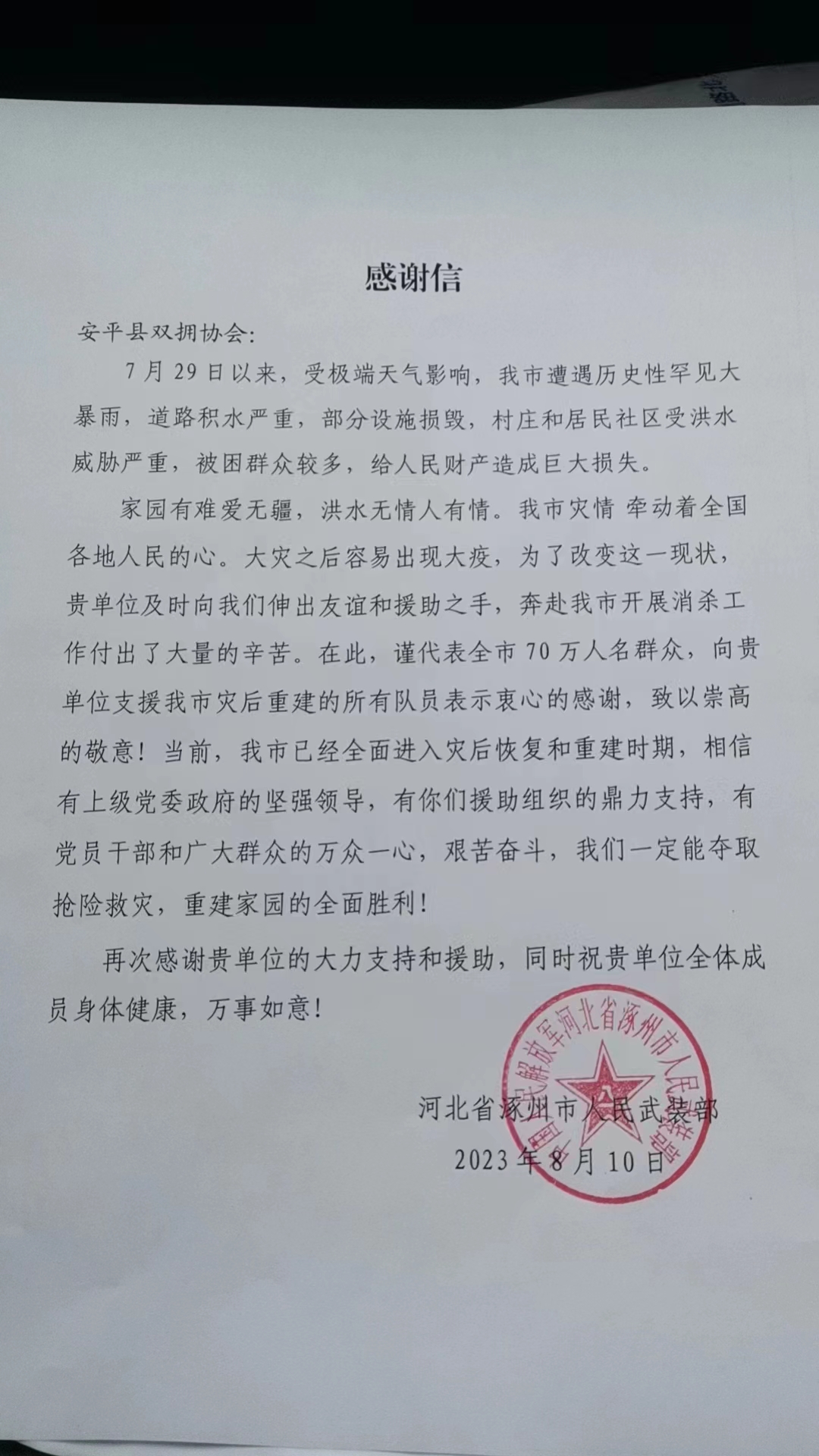 8月11日,在圓滿完成指定消殺任務(wù)后,涿州市人武部為安平縣雙擁協(xié)會發(fā)來了感謝信,受到幫助的相關(guān)單位和部門也對安平縣雙擁協(xié)會的消殺支援表示感謝。“一方有難,八方支援。這些都是我們的舉手之勞,我們愿盡一點(diǎn)綿薄之力,用實(shí)際行動把溫暖傳遞到災(zāi)區(qū)人民心中,幫助大家重建家園。”任英奎說。