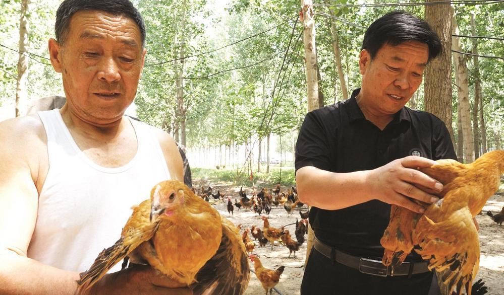 6月15日,平固店鎮養殖基地負責人李建青(右一)查看林下柴雞和大鵝養殖情況。 李清波 攝