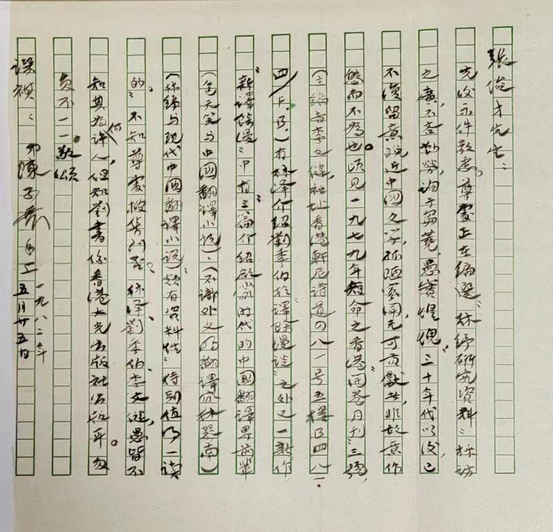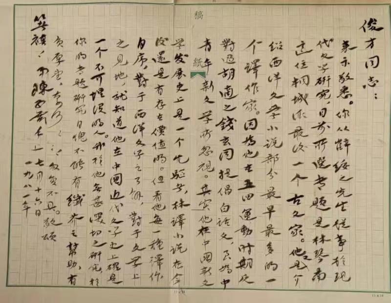 先后示件敬悉。尊處正在編選《林紓研究資料》,采訪之廣,不吝勤勞。詢于芻蕘,愚實惶愧!三十年代以后,已不復留意晚近中國文學,孤陋寡聞,無可貢獻者,非故意作態而不為也。頃見一九七九年短命之香港《開卷月刊》三號(主編李文健,社址香港軒尼詩道四八一號五樓B四八一·四/F·B),有林澤介紹劉季伯于《譯余漫談》之外又一新作《新譯余漫談》中有三篇介紹啟蒙時代的中國翻譯界前輩《包天笑與中國翻譯小說》《不識外文的翻譯家林琴南》《林紓與現代中國翻譯小說》,頗有資料性,特別值得一讀的。不知尊處搜集到否?林澤、劉季伯、李文健,愚皆不知其為何許人也,但知劉書系香港大光出版社出版耳。