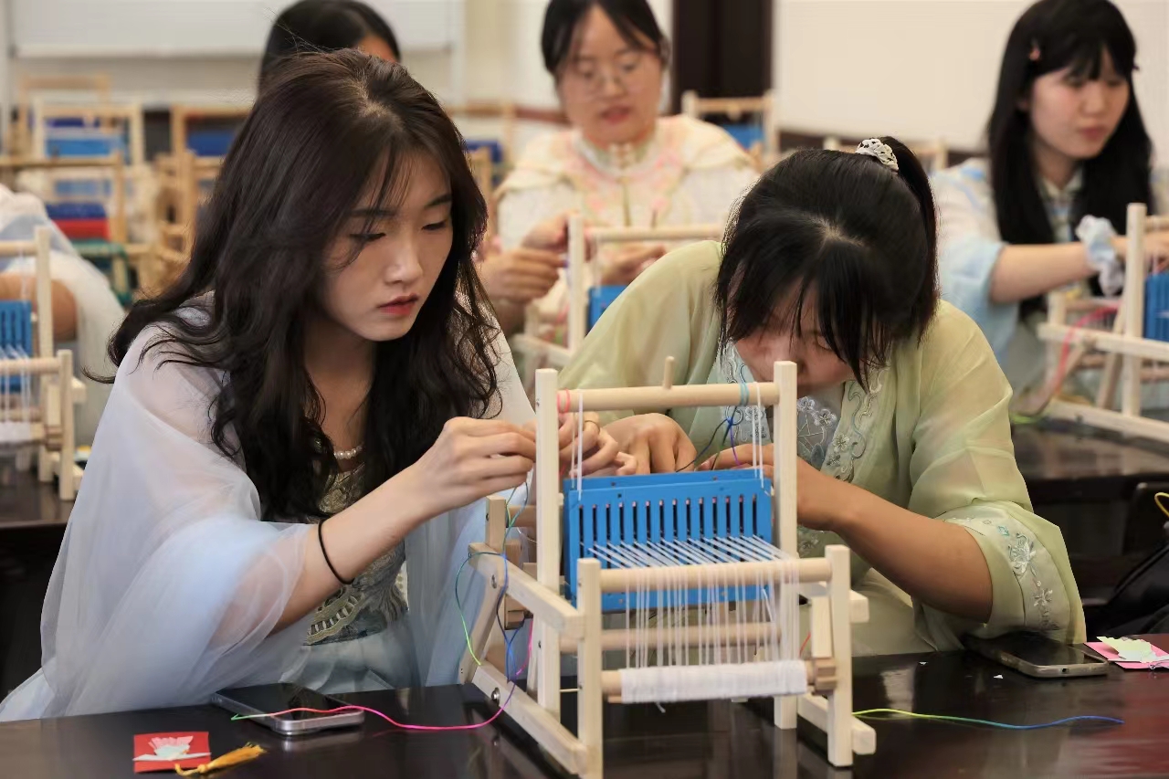 隨后,指導老師又帶領老師們編織手繩,準備好材料和工具后,指導老師對編繩的基本步驟和編織要點進行了講解,現場老師們圍在一起認真聽講,并挑選自己喜愛的編繩顏色做配搭,跟著老師一點一點地學習。經過老師的耐心指導,大家逐漸掌握了編織技巧,編織的動作越來越快,手鏈也越來越長。慢慢地,老師們手中一根根簡單的繩線變成了精美的手鏈,大家開心地互相展示著各自的手鏈,臉上都露出了成功的喜悅。