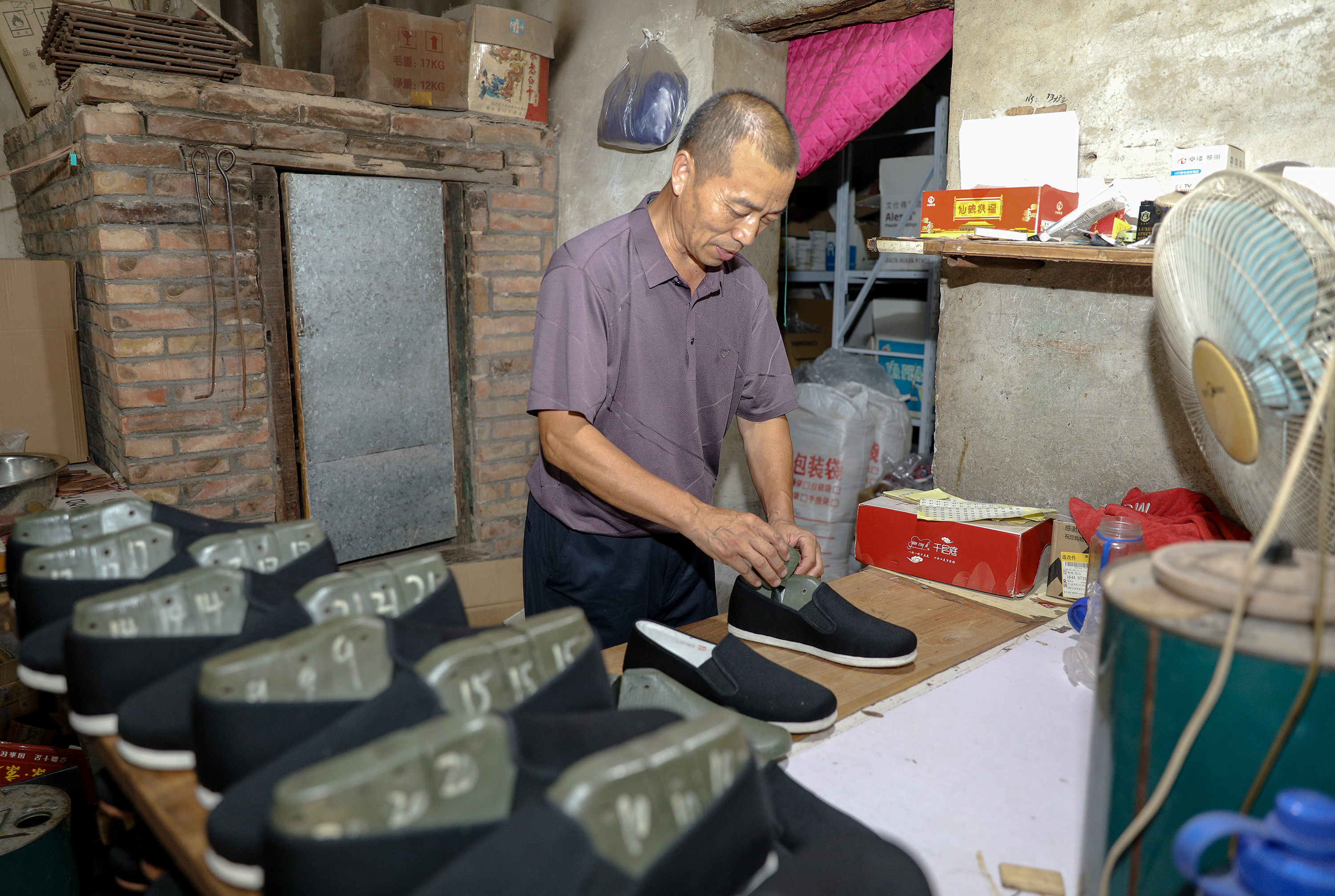 崔路軍是土生土長(zhǎng)的黑林村人,從小就愛穿媽媽納的千層底布鞋。高中畢業(yè)后,他在村里創(chuàng)辦了手工布鞋加工作坊,一干就是30年,到現(xiàn)在已經(jīng)創(chuàng)建了自己的品牌,線上線下同時(shí)銷售,訂單不少,吸引了周邊100多名剩余勞動(dòng)力在這里打工。