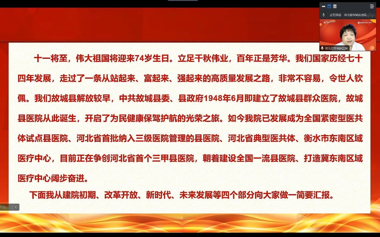 居艷梅以《七十五載風雨發展路 造福一方優醫惠民生》為題,用大事記的方式,從建院初期、改革開放、新時代、未來發展等四個部分,分享了故城縣醫院的發展歷程,追憶崢嶸歲月,重溫奮斗歷史,表達了對老一輩故醫人艱苦奮斗、接力奉獻的感激與敬佩之情。