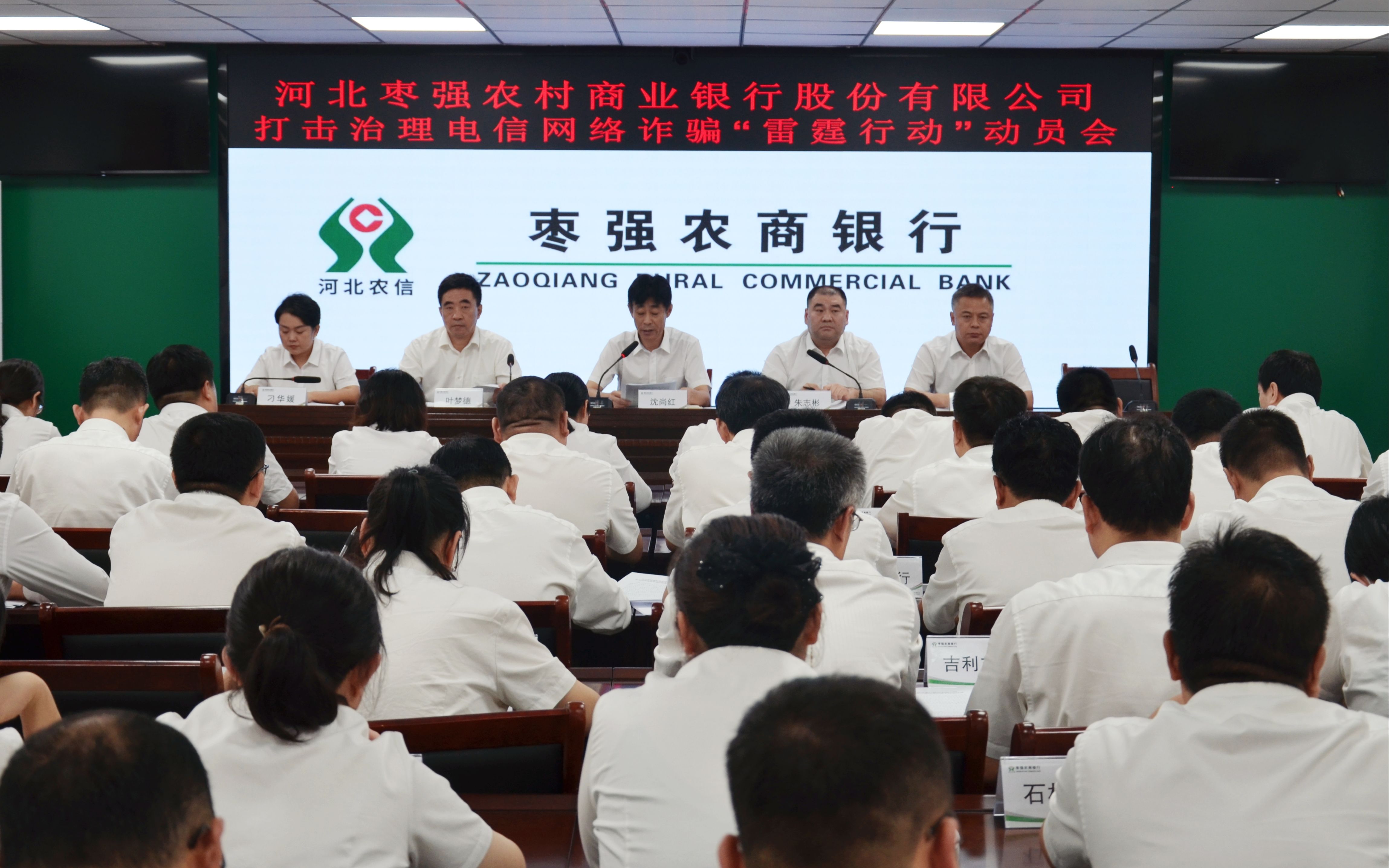 為深入貫徹落實黨中央和各級黨委關于打擊治理電信網絡詐騙有關決策部署,進一步加大反詐力度,維護人民群眾資金安全,營造綠色安全的金融環境,9月27日下午,棗強農商銀行組織召開打擊治理電信網絡詐騙“雷霆行動”動員會。總行班子成員、相關部室人員、各網點負責人、委派會計共計70余人參加。會議由黨委副書記、行長朱志彬主持。