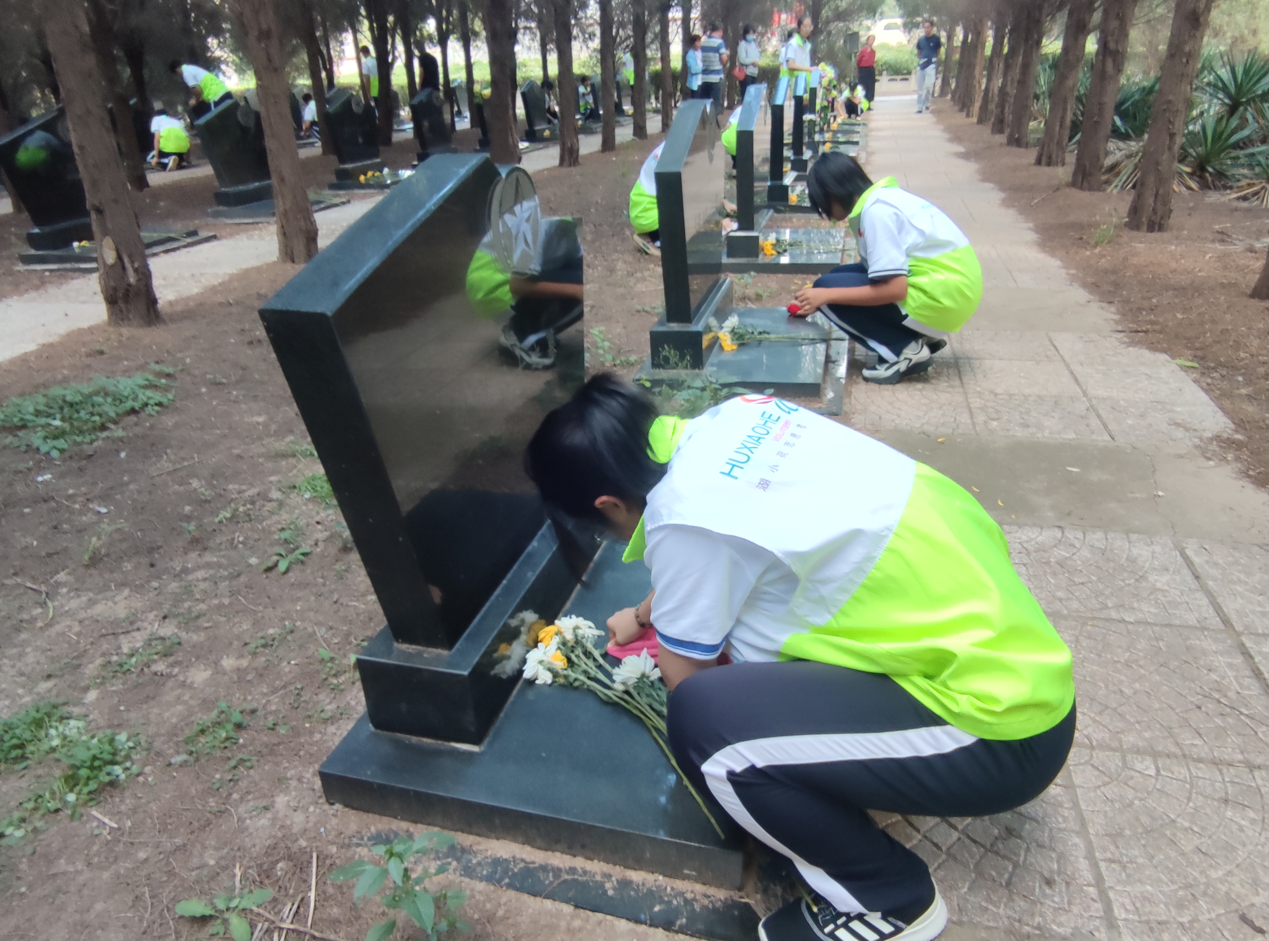 在烈士陵園內(nèi),大家來到革命烈士墓碑前,為先烈掃去墓碑上的塵土,除去墓碑旁的雜草,并將手中的黃菊置于烈士墓碑前,向革命烈士默哀,寄托無限哀思。