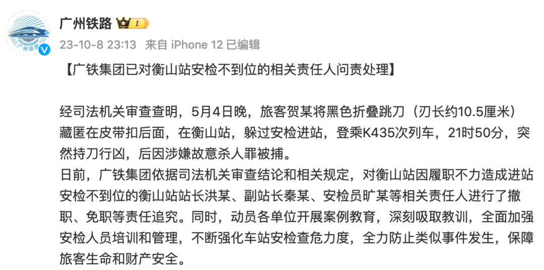 10月8日晚,廣鐵集團通報,已對衡山站安檢不到位的相關責任人問責處理。