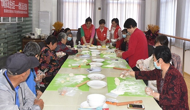 日前,在景縣一社區活動室內,正在開展巾幗家政進社區活動,居民們在面點師的指導下手工制作面食。