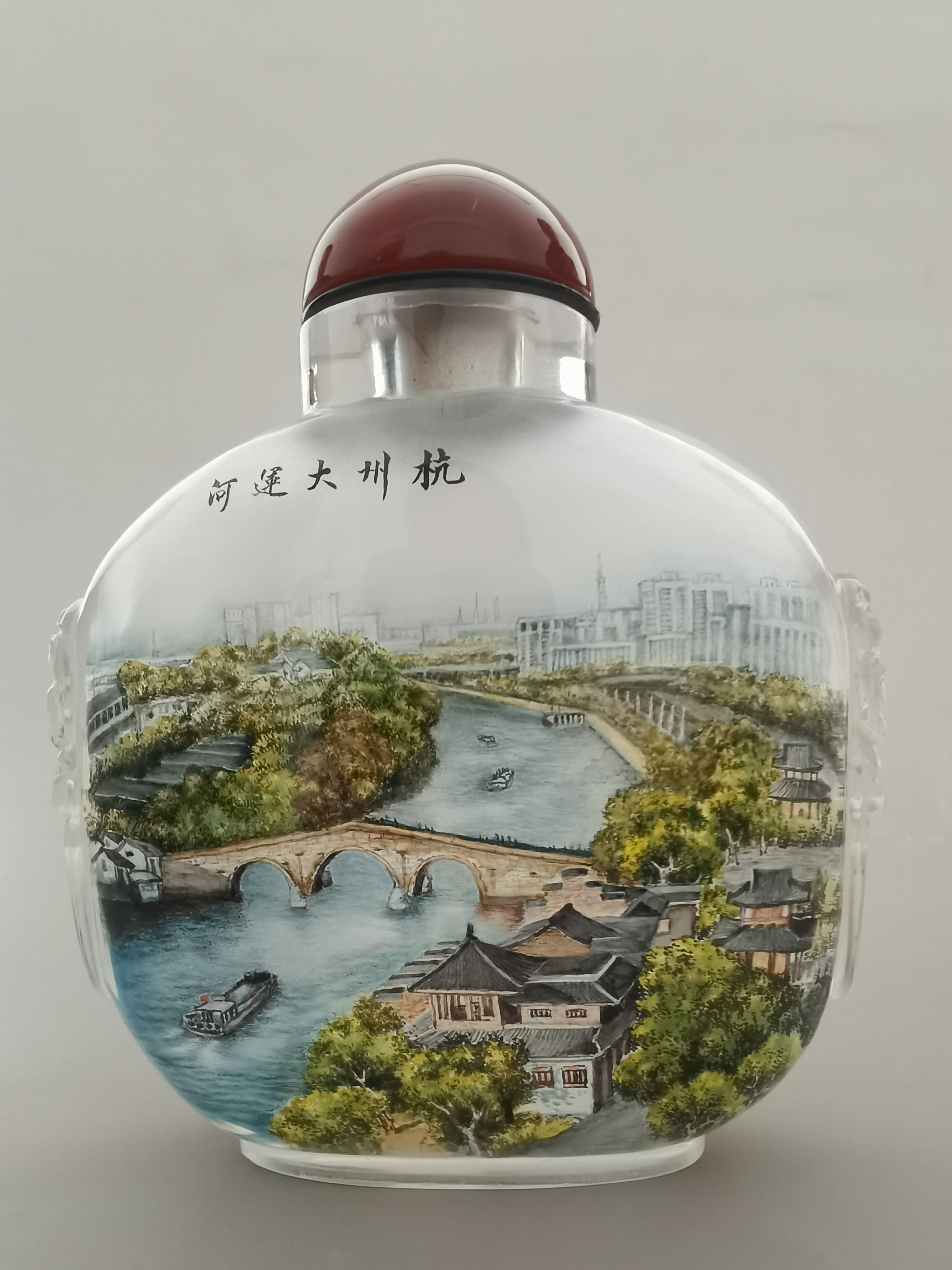 張汝財用國家級非物質文化遺產——衡水內畫的形式,通過金屬勾筆反畫技巧,在鼻煙壺里皴擦點染勾勒,并用油畫和國畫中西合璧的畫法,繪制了《羅哲文先生肖像》、《老北京城門樓》、世界非遺《八達嶺長城》及《大運河》四幅內畫鼻煙壺作品,表達羅哲文先生對我國文化遺產保護事業無私奉獻的崇高敬意。