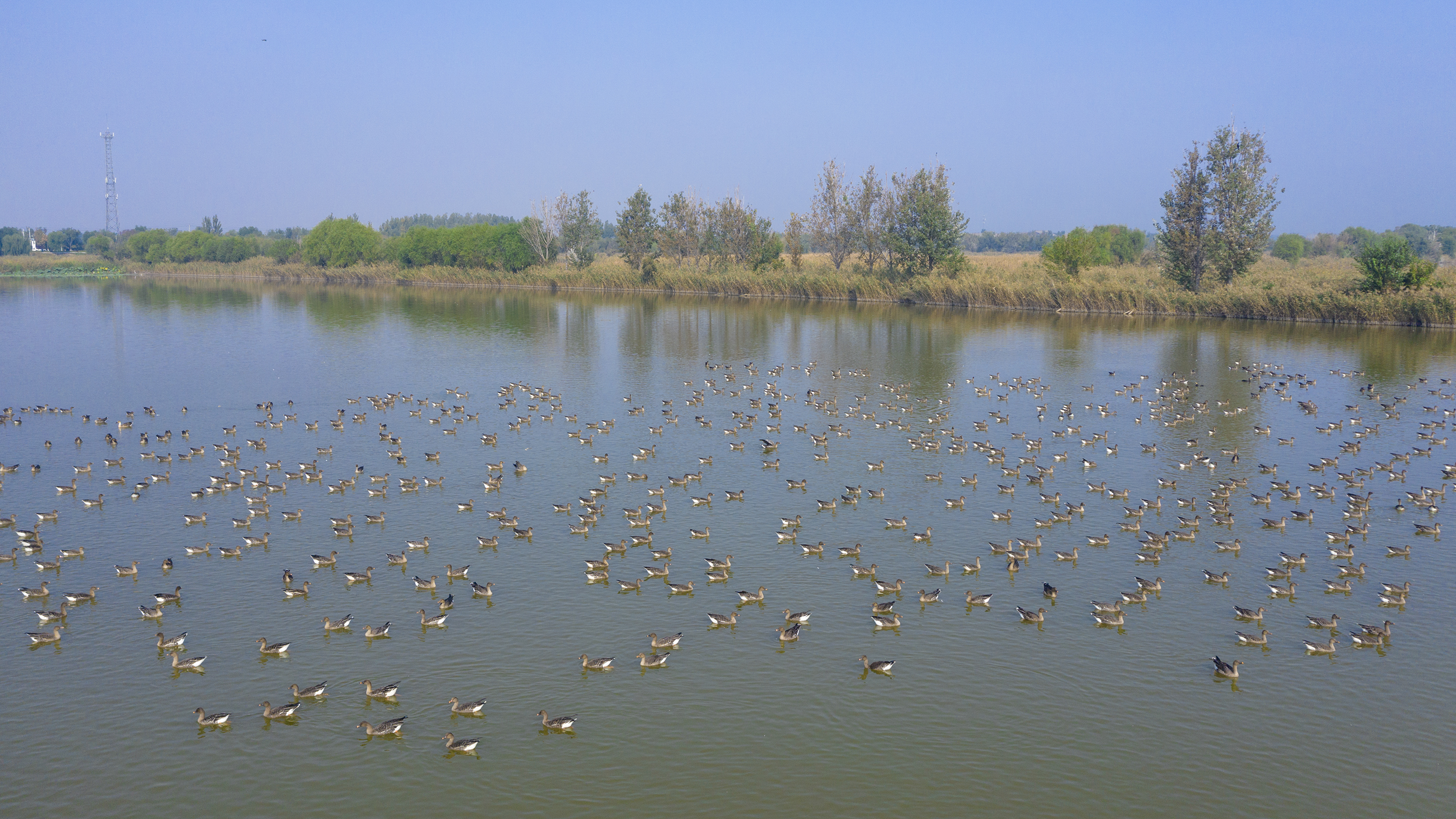 10月11日,群雁在衡水湖棲息飛翔。隨著氣溫逐漸下降,今年衡水湖秋冬季候鳥遷徙悄然開啟,目前已有萬余只越冬候鳥抵達(dá)衡水湖。衡水湖位于河北省衡水市,是華北平原唯一保持沼澤、水域、灘涂、草甸和林地等完整濕地生態(tài)系統(tǒng)的國家級自然保護(hù)區(qū),素有“京津冀最美濕地”等美譽。