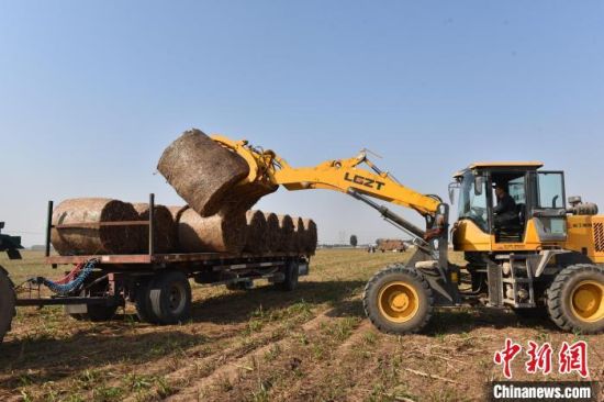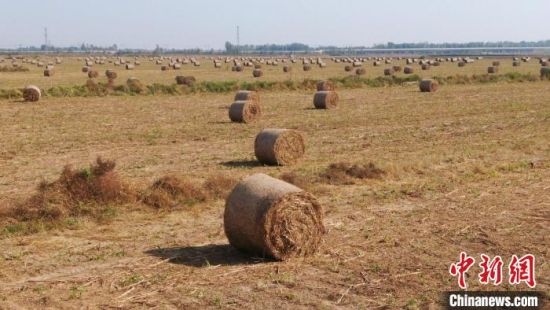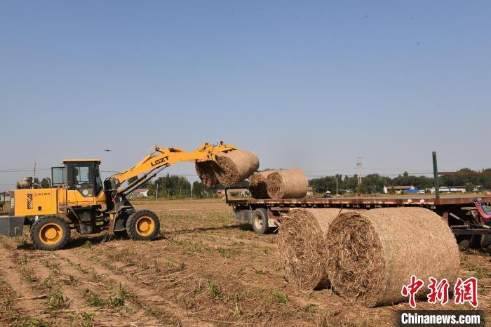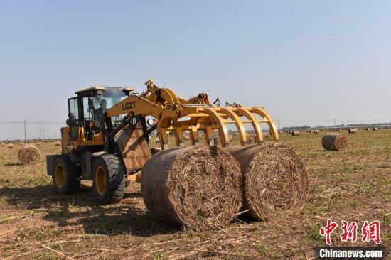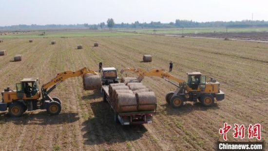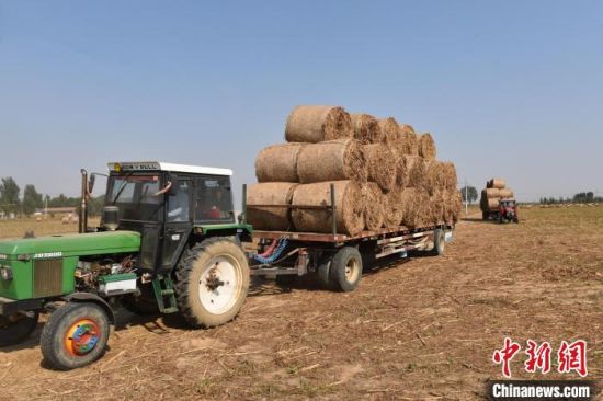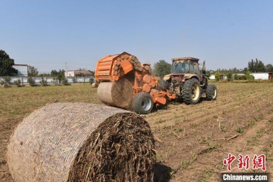 10月16日,打捆機在河北衡水景縣一農田里來回穿梭進行收草打捆。高雷 攝
