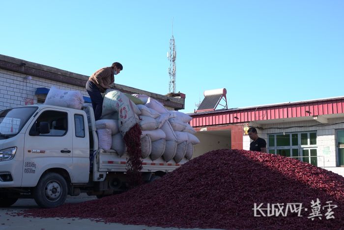 周玉龍(右)收購的辣椒正在卸貨。長城網·冀云客戶端記者 李沛涵 攝