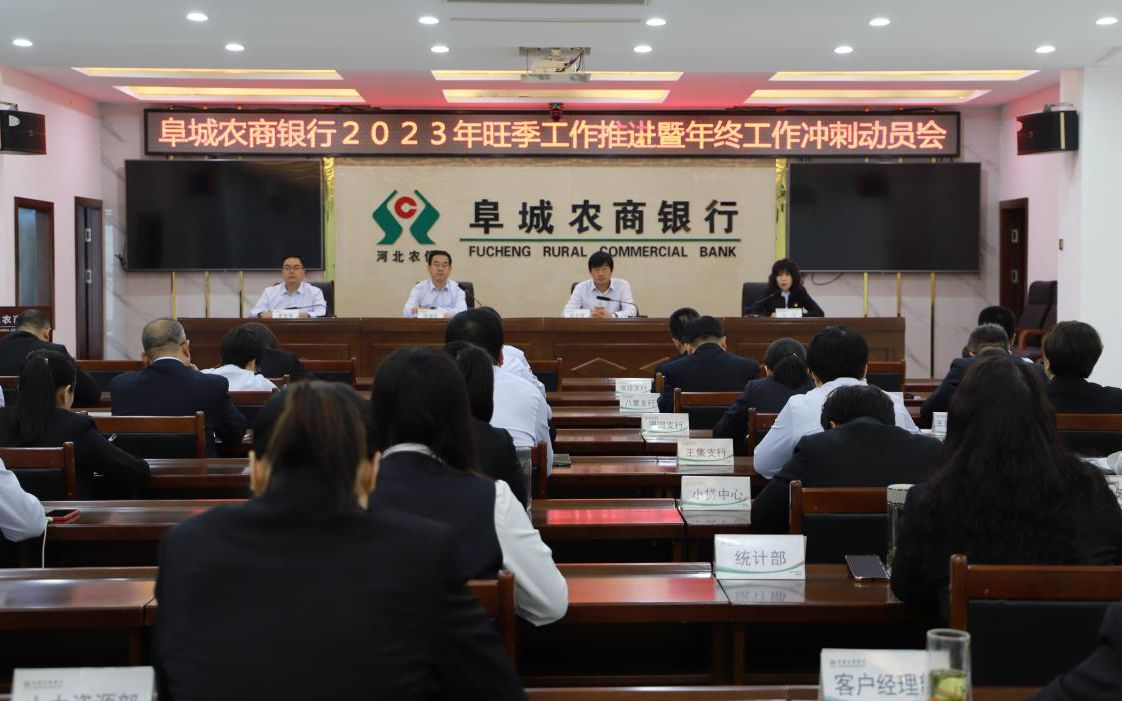 10月25日上午,阜城農商銀行在總行二樓大會議室召開2023年旺季工作推進暨年終工作沖刺動員會,總結前三季度業務經營工作,查找問題短板,認真分析原因,準確研判形勢,強化舉措,狠抓落實,奮力沖刺全年任務目標。總行領導班子成員、各部室經理、支行行長、分理處負責人參加會議,會議由紀委書記、監事長周福勝主持。