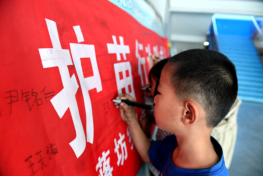 小學生們在活動條幅上簽字。崔賢飛 攝