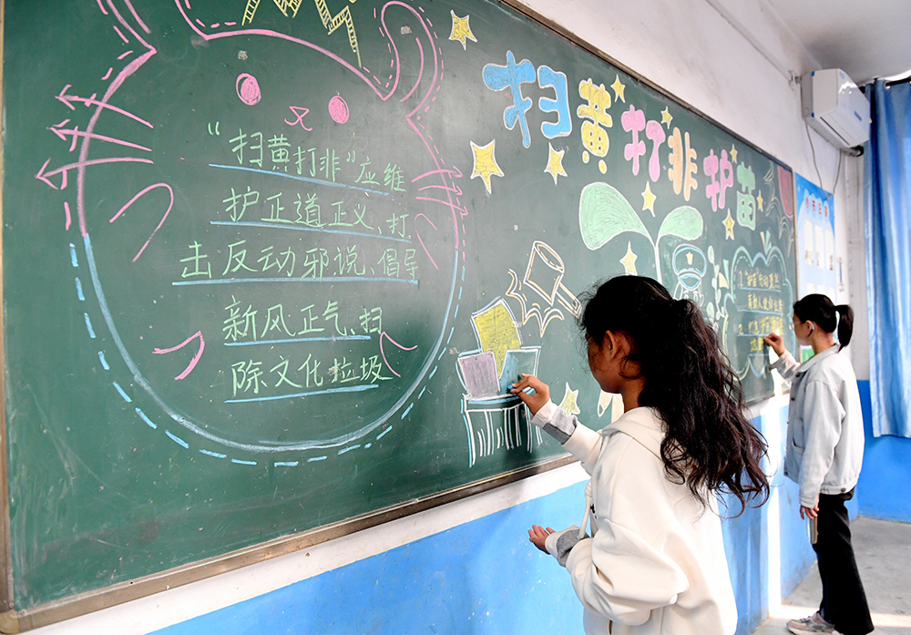 小學生們在書寫專題黑板報。崔賢飛 攝