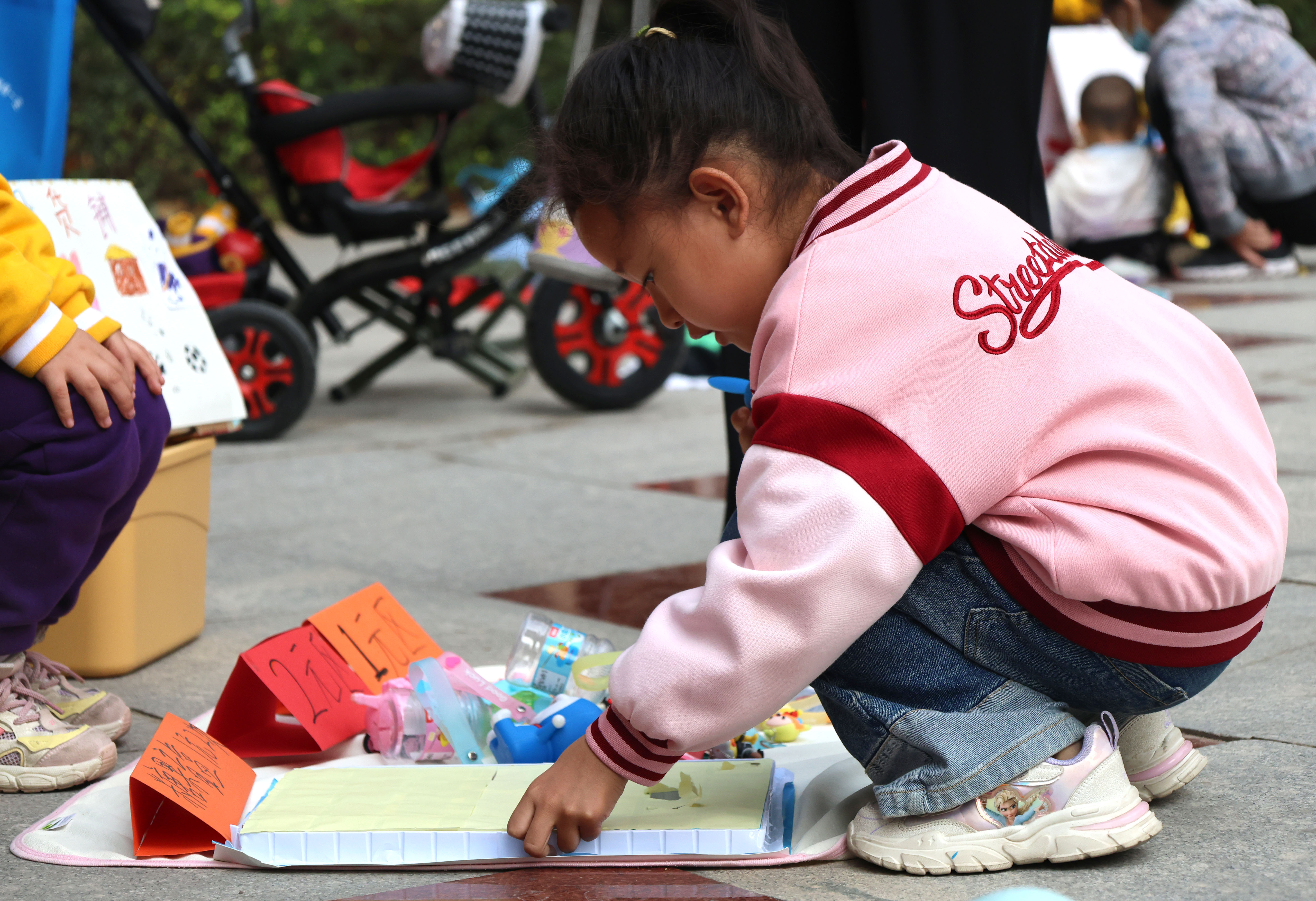 當(dāng)天上午,孩子們在家長的帶領(lǐng)下早早來到廣場,開始“裝扮”自己的小攤位,將玩具、繪本等物品整齊地擺好,并把自己設(shè)計的攤位海報放在顯眼的位置。一眼望去,每一個攤位的商品都琳瑯滿目。