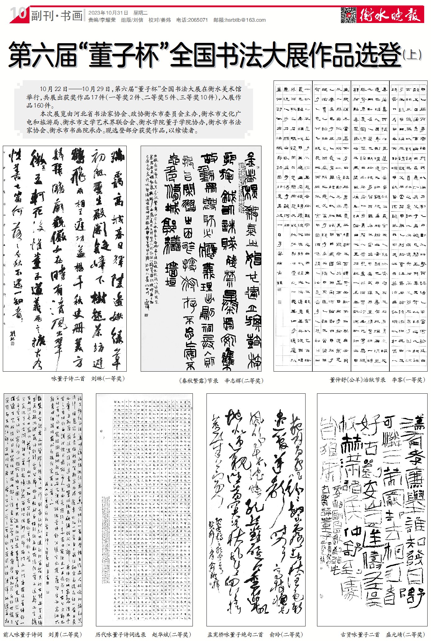 10月22日——10月29日,第六屆“董子杯”全國書法大展在衡水美術館舉行,共展出獲獎作品17件(一等獎2件、二等獎5件、三等獎10件),入展作品160件。