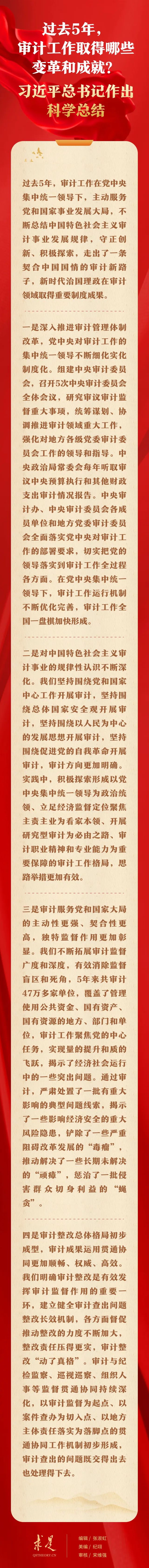 11月1日出版的第21期《求是》雜志刊發習近平總書記重要文章《在二十屆中央審計委員會第一次會議上的講話》。在這篇重要文章中,習近平總書記從4個方面對過去5年的審計工作進行科學總結,強調:“審計工作取得的這些變革和成就,是新時代中國特色社會主義思想在審計領域的具體實踐,彰顯了黨的創新理論的真理力量,具有鮮明的時代性和實踐性。要總結好、運用好黨關于新時代審計工作的理論成果和實踐成果,長期堅持并不斷豐富發展,指導審計工作實現更大作為。”