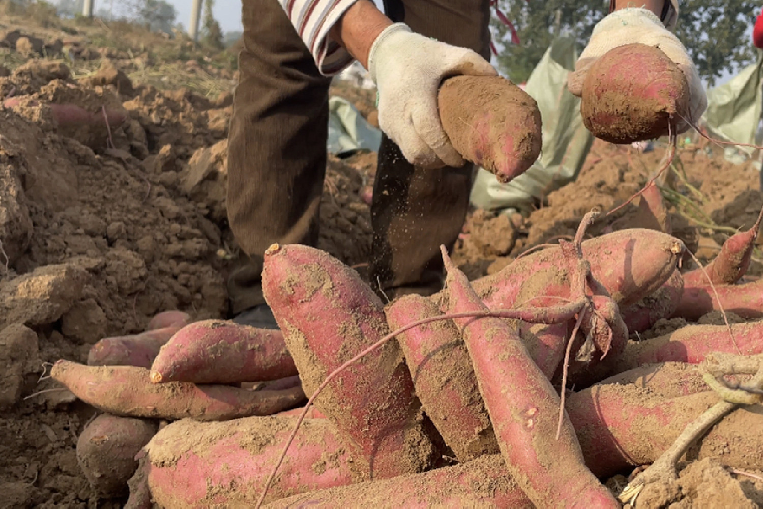 村民們手腳麻利地揀拾蜜薯。劉圣 攝