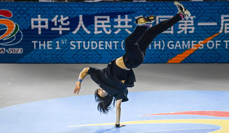 11月4日,第一屆全國學生(青年)運動會霹靂舞比賽在廣西欽州市體育中心體育館舉行。(新華社記者 張愛林/攝)