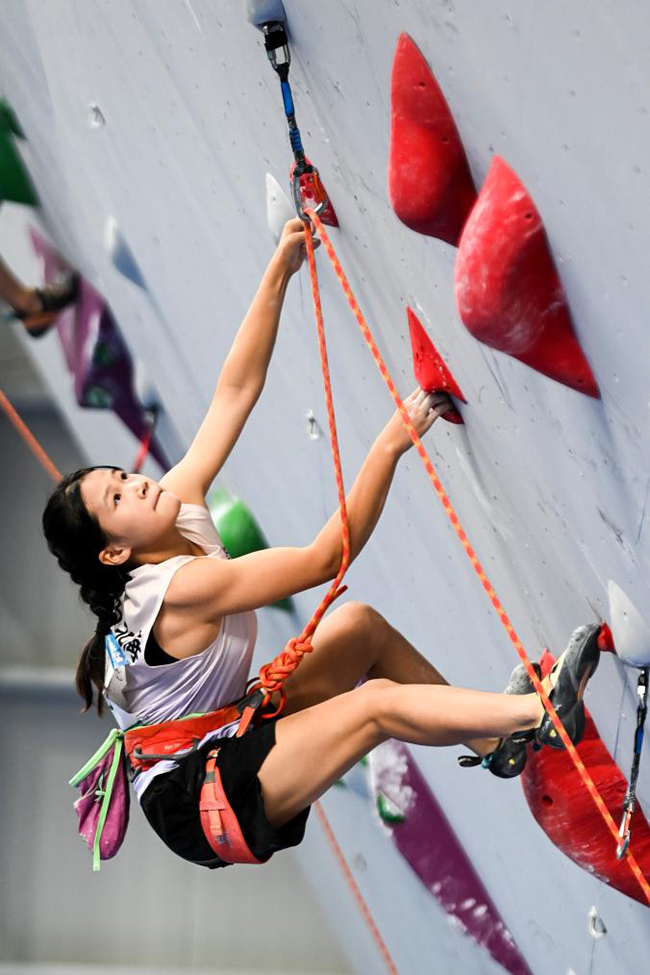 11月10日,第一屆全國學生(青年)運動會攀巖項目難度賽在廣西馬山縣古零鎮初級中學攀巖館舉行。(新華社記者 曹祎銘/攝)
