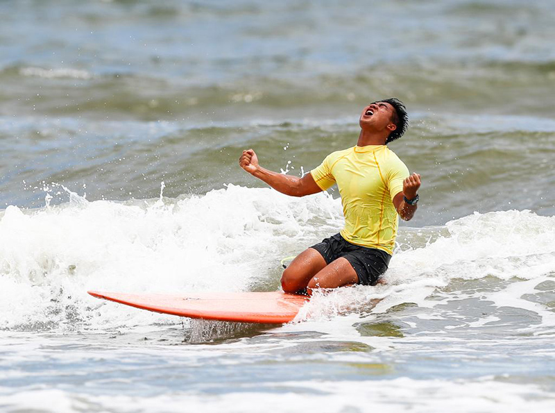 7月11日,??陉犨x手黃耀書在比賽后慶祝。他以14.7分的成績獲得冠軍。當日,第一屆全國學生(青年)運動會沖浪項目男子長板決賽在廣西北海市舉行。(新華社記者 胡星宇/攝)