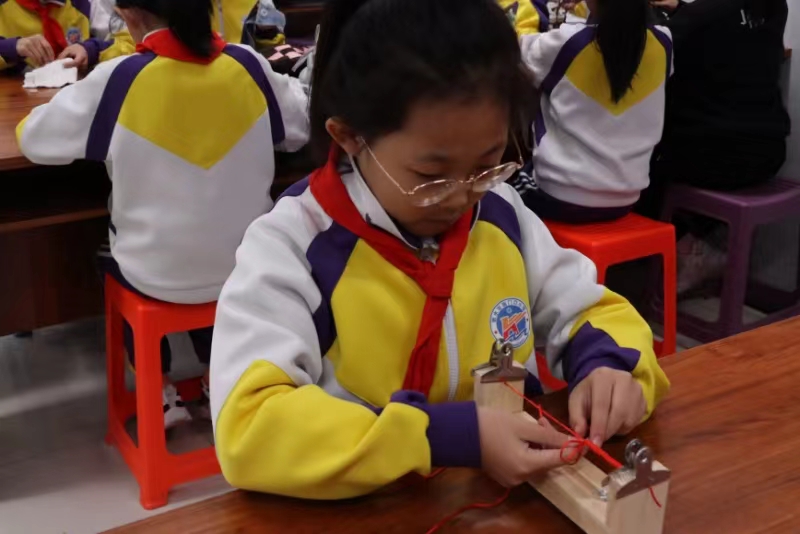 勞動技能的提升需要多多實踐,是一個循序漸進的過程,看!這位心靈手巧的小同學,正在編手鏈呢,她認真的表情仿佛在說:“別看我的年紀小,勞動本領你別小瞧!”
