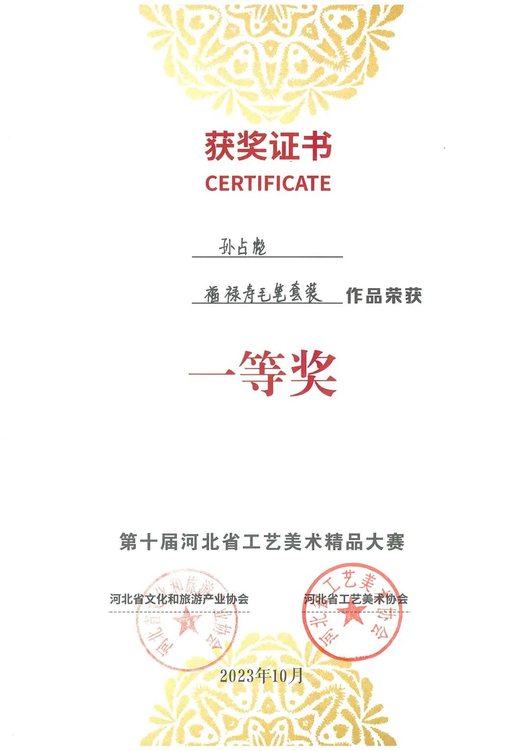 濱湖新區(qū)以文創(chuàng)作為文旅商融合的重要抓手,深入挖掘厚重的歷史文化資源,大力推進侯店毛筆等非物質(zhì)文化遺產(chǎn)保護、傳承、創(chuàng)新,積極引導孫占彪毛筆廠創(chuàng)新豐富具有代表性的城市文化商品,鼓勵參加各類比賽、展銷會等活動,自2023年以來孫占彪毛筆廠子母筆榮獲“京畿福地 河北友禮 外事禮品征集評選活動”銀獎、侯店毛筆系列作品榮獲“第10屆河北省特色文化產(chǎn)品博覽交易會精品展”特別榮譽獎、傘帽雞炬筆純狼毫六只裝榮獲“第九屆河北省工藝美術(shù)精品大賽”一等獎以及榮獲“河北省級鄉(xiāng)村工匠名師”等獎項,提高了濱湖新區(qū)影響力、知名度和美譽度。