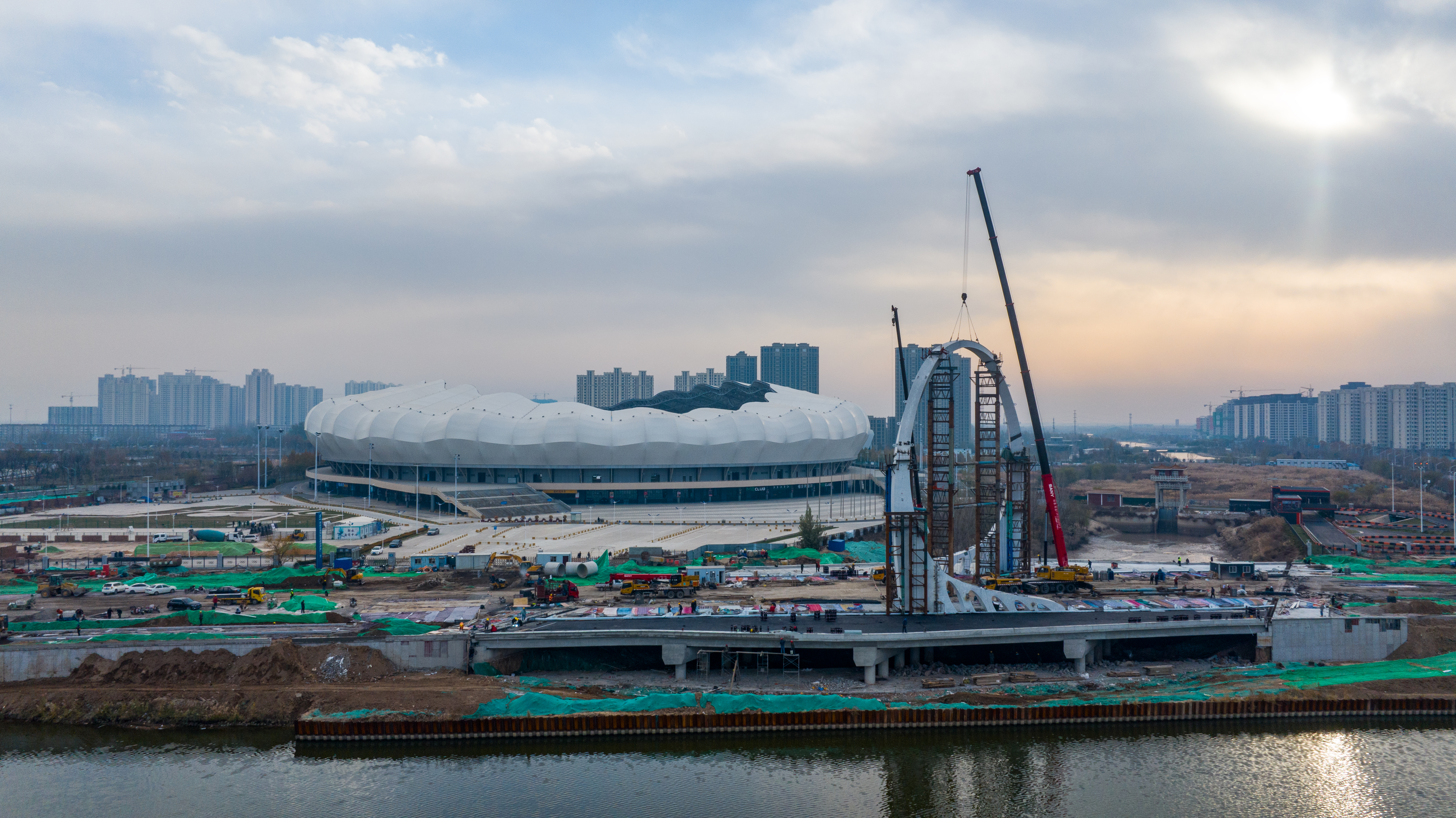 巨吳渠大橋位于道路與滏陽河巨吳渠交匯處,南鄰?qiáng)W體中心、北望衡水博物館,是滏陽路改造提升項(xiàng)目的一大重點(diǎn)分項(xiàng)工程,以“聯(lián)結(jié)周邊建筑、打造整體景觀”為設(shè)計(jì)方向,以水為媒、以橋?yàn)榻椋瑢⒕迏乔髽蚓坝^打造成市區(qū)特色景觀。據(jù)悉,原巨吳渠大橋?qū)?2m,長105m,雙向四車道,為滿足滏陽路道路改造提升,改造后的巨吳渠大橋標(biāo)準(zhǔn)寬度52m,橋兩側(cè)另各增設(shè)一個觀景平臺,在橋上設(shè)置一座鋼結(jié)構(gòu)拱門進(jìn)行景觀打造,拱門最高處為37m,拱身順應(yīng)河道方向。