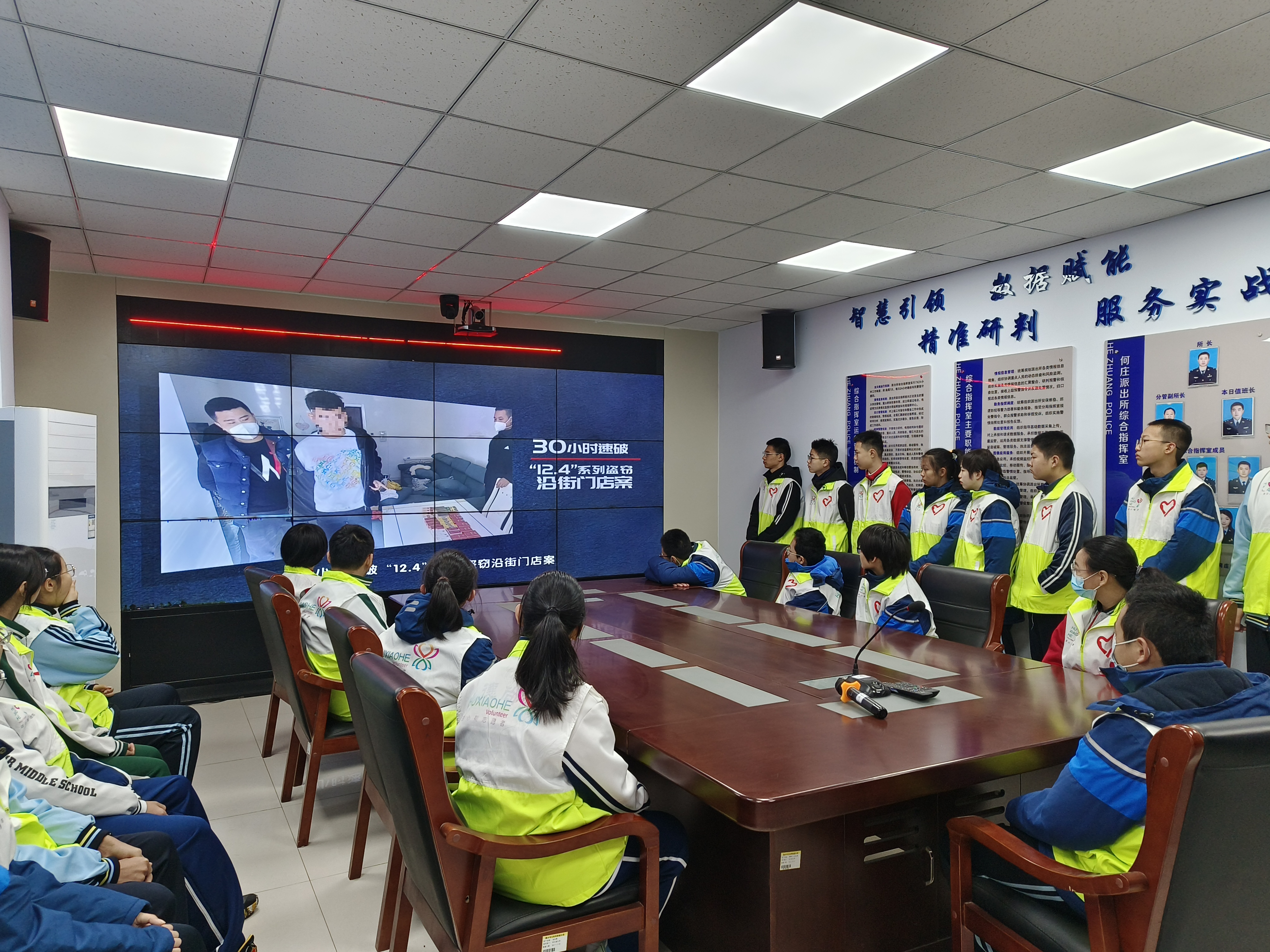 活動開始,十余名青少年志愿者在民警的帶領下參觀何莊派出所。有機會能走進心目中神秘的派出所,同學們心中滿是興奮和期待。民警帶領志愿者觀摩了派出所的戶籍室、接處警大廳、值班室等,讓同學們了解接處警流程。