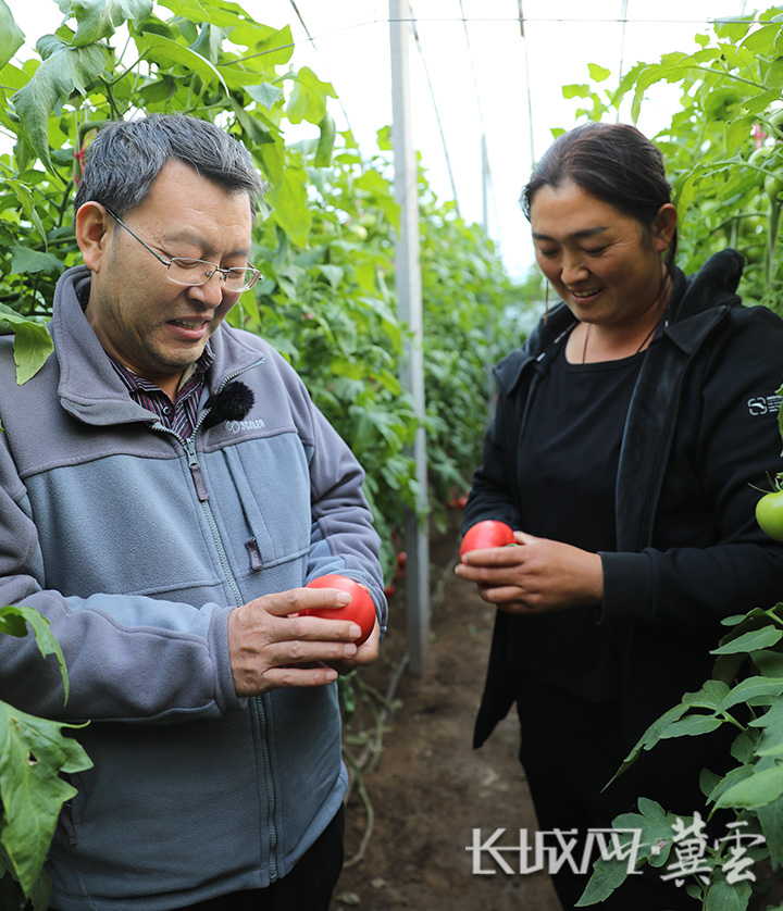 河北省農林科學院植物保護研究所研究員邸墊平與種植戶在大棚內交流西紅柿生長情況。長城網·冀云客戶端記者 李佳琦 攝