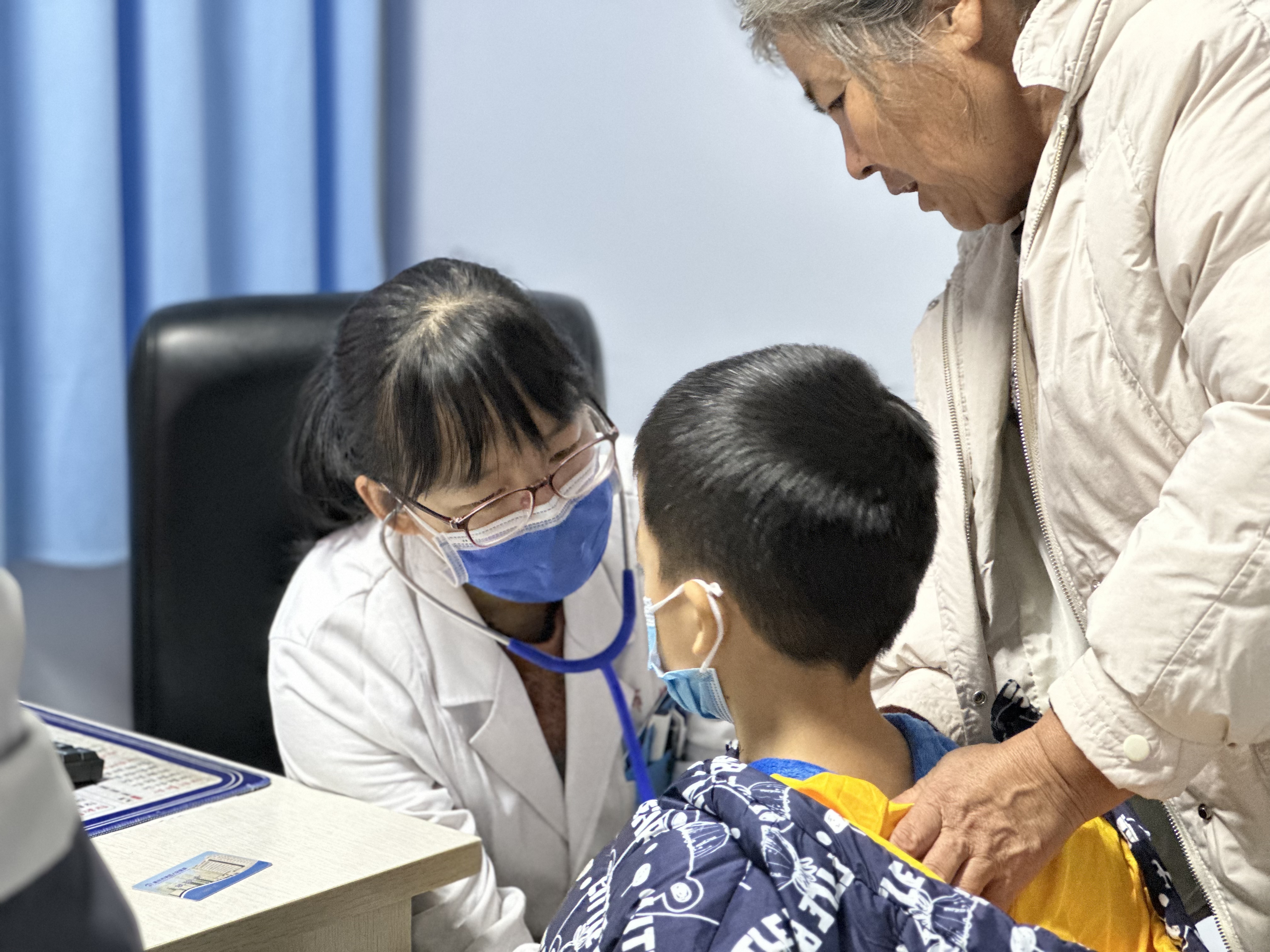 “小朋友張張嘴……啊……”“阿姨給你聽聽啊”……捂熱聽診器后,馬耐東把聽診器放在患兒胸前。