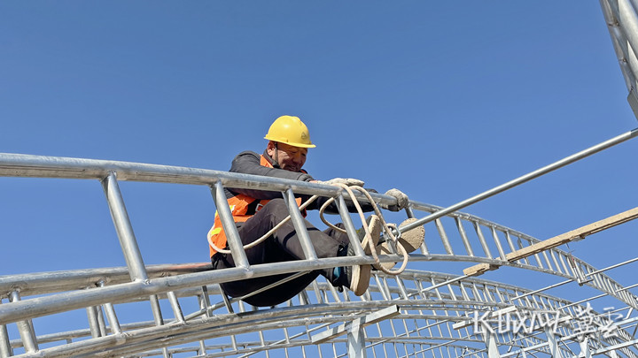 工人對(duì)大棚拱梁進(jìn)行矯正。