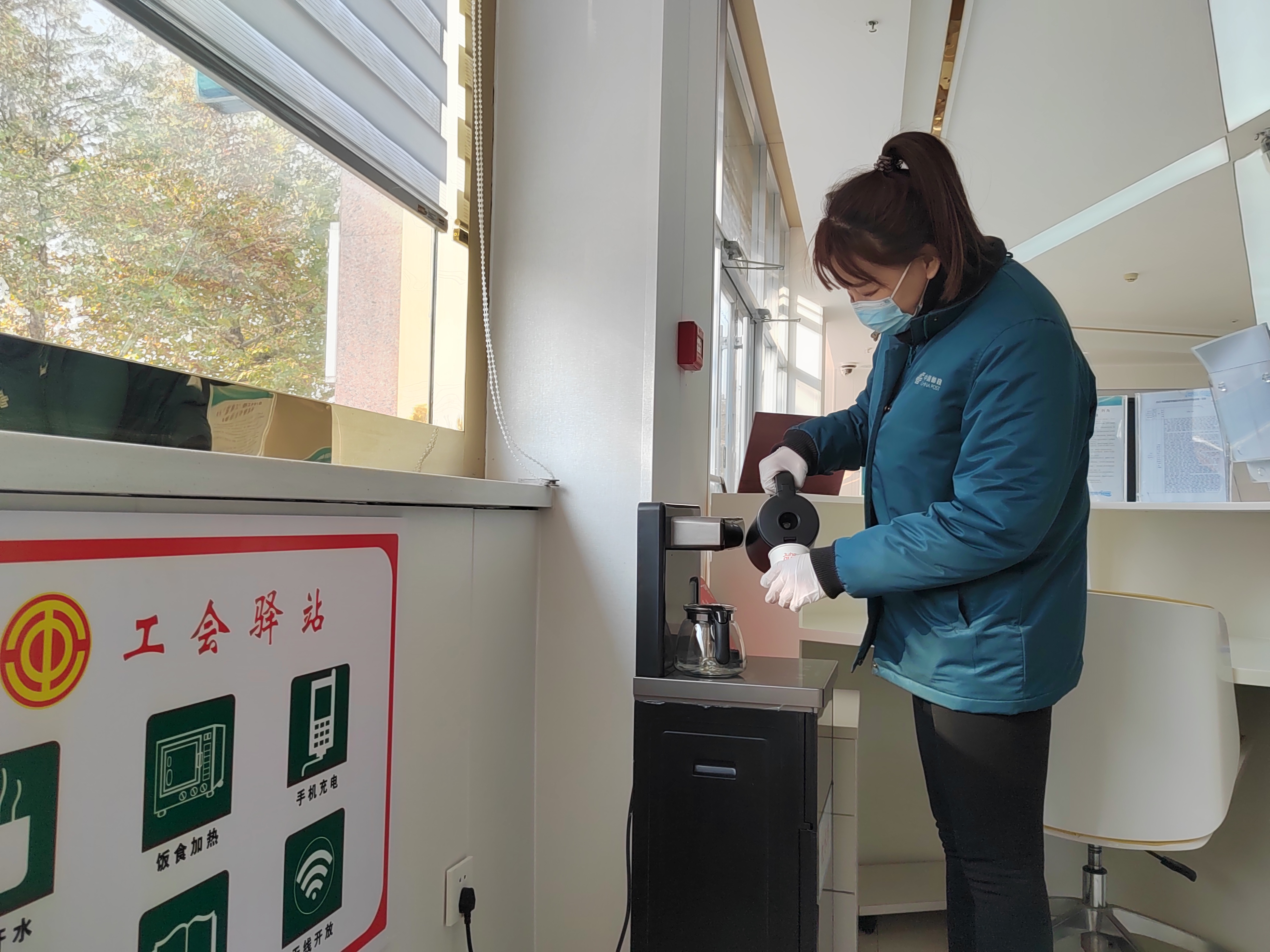 走進“工會驛站”,應急藥品、飲水機、空調、充電器等設施一應俱全。剛送完外賣的王博文摘下頭盔和手套,倒了一杯溫開水后,在靠近充電口的地方坐下。“剛好手機也快沒電了,要不然一會還不好接單呢,現在天冷了,只要在街道上看見掛著‘工會驛站’牌子的門店,都可以進來充充電、喝口水,挺方便的。”