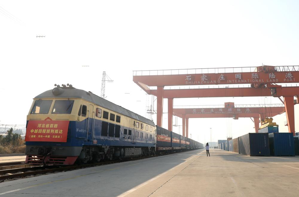 河北省首趟中越回程班列抵達(dá)石家莊國(guó)際陸港(2023年12月5日攝)。新華社發(fā)(梁子棟攝)