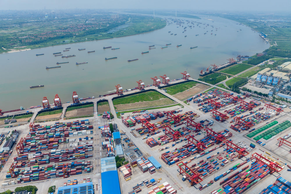 武漢陽(yáng)邏港一期碼頭(2023年7月5日攝,無(wú)人機(jī)照片)。新華社記者 伍志尊 攝