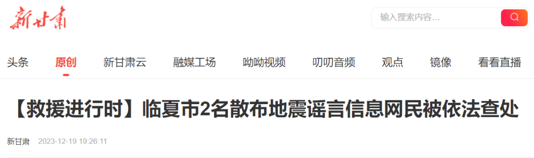 12月18日23時59分,臨夏州積石山發生6.2級地震。臨夏市2名網民卻在未經證實的情況下,編造地震不實信息,在網絡媒體發布、直播“中國地震網最新消息,臨夏今晚夜間2點二十六分三十五秒,還有一次8.2級劇烈余震!”