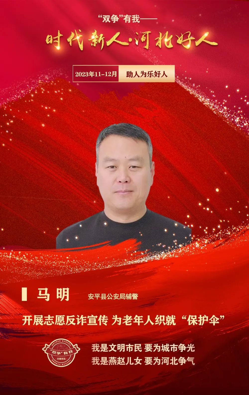 “我是文明市民、要為城市爭光,我是燕趙兒女、要為河北爭氣”。12月21日,“雙爭”有我——2023年11至12月“時代新人·河北好人”發布暨道德模范與身邊好人現場交流活動在唐山遷安市舉行。我市安平縣公安局輔警馬明入選助人為樂類“時代新人·河北好人”。