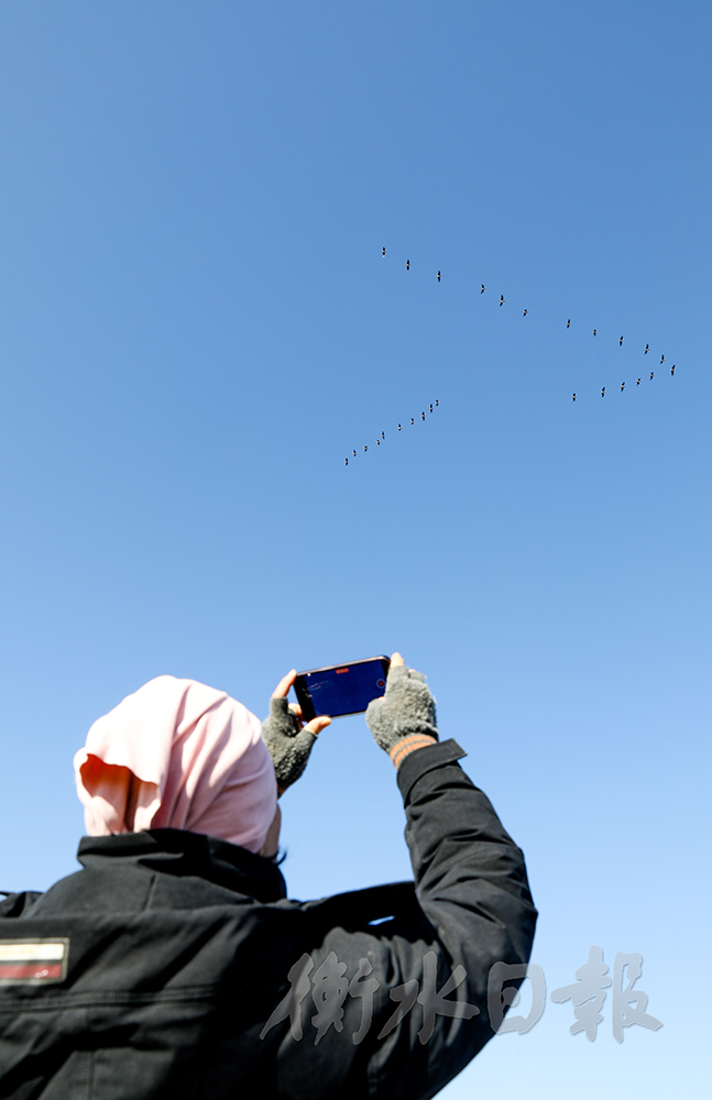 “這是我2012年拍攝到的豆雁遷徙到衡水湖的畫面,近萬只豆雁同時展翅飛翔在濕地上空;這是2016年7月份,我們在小湖區拍到的青頭潛鴨,一雌一雄,帶著11只雛鴨,這是我們在衡水湖第一記錄到青頭潛鴨在這里孵化了……”張林鳳拿出手機自豪地展示自己的得意之作。