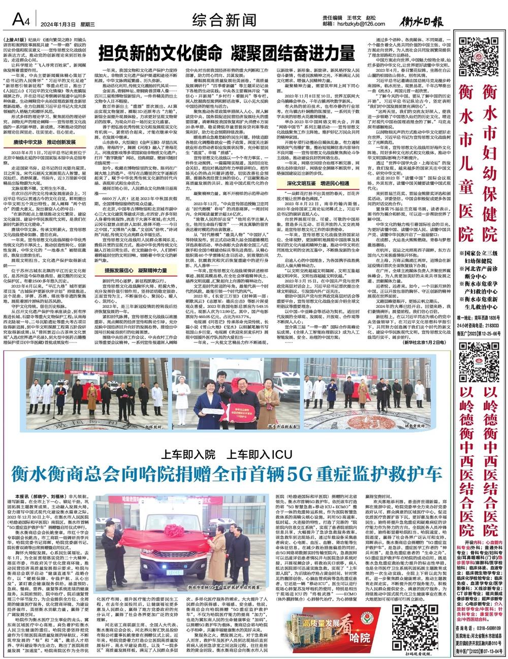 非凡領(lǐng)航,譜寫新篇。在全市上下一心、鉚足干勁,鞏固拓展主題教育成果,主動融入發(fā)展大局,奮力譜寫中國式現(xiàn)代化建設(shè)衡水篇章之際,2023年12月30日上午,在衡水市人民醫(yī)院(哈勵遜國際和平醫(yī)院)南院區(qū),衡水市首輛“5G重癥監(jiān)護(hù)救護(hù)車”捐贈暨啟用儀式舉行。