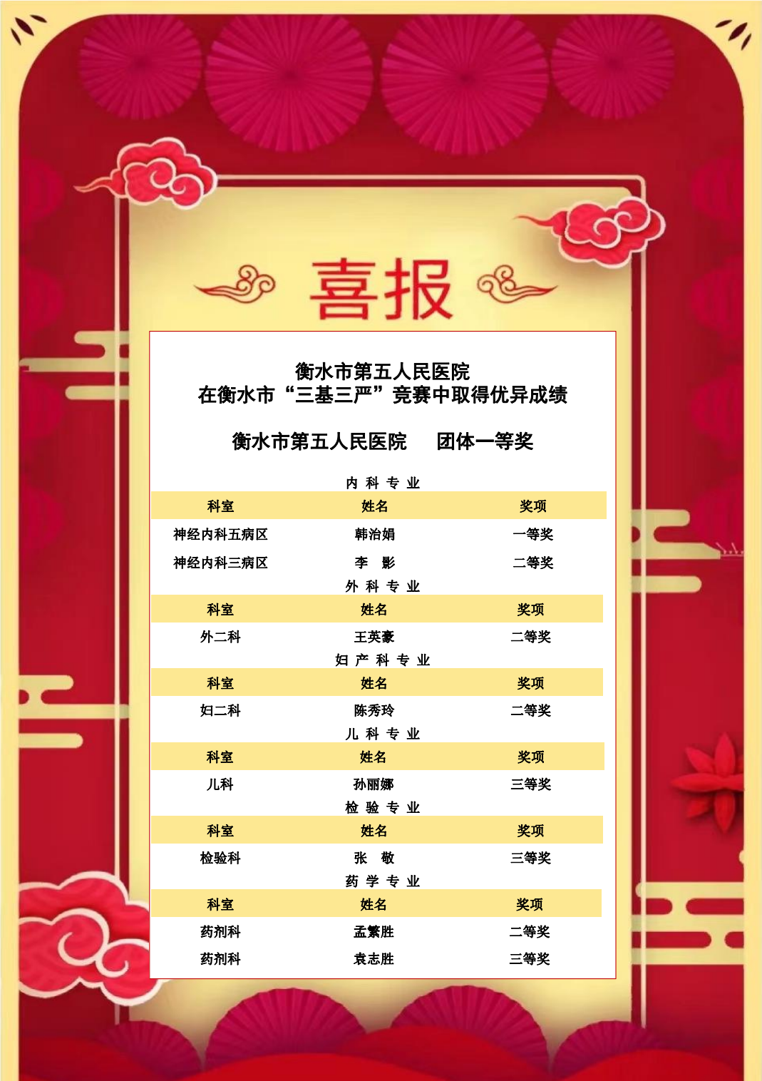 近日,衡水市衛生健康委員會公布2023全市醫療機構醫務人員“三基三嚴”競賽活動結果:衡水市第五人民醫院以優異的成績,在25家醫療機構中脫穎而出,勇奪醫療機構排名第一名,同時在專業排名中,榮獲1個一等獎,4個二等獎,3個三等獎。金燦燦的成績讓五院人倍感自豪,精神振奮,也為剛剛啟航的2024年開了一個好頭。