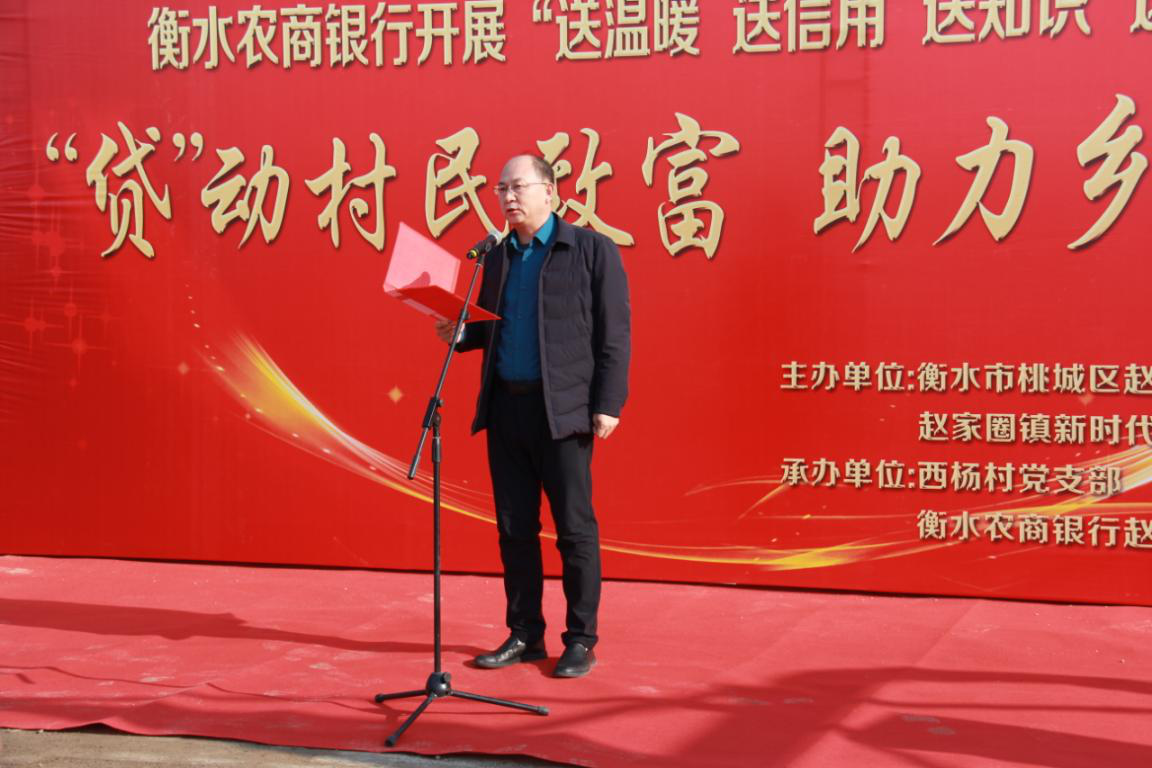 為認真貫徹落實省聯社助力鄉村振興總體部署,全面做好信用村創建工作,近日,桃城區人民政府、趙家圈鎮人民政府、桃城區地方金融監督管理局、桃城區退役軍人事務局、趙家圈鎮西楊村黨支部、衡水農商銀行聯合舉辦“信用村”授牌儀式暨“送溫暖 送信用 送知識 送歡樂”活動在趙家圈鎮西楊村舉行,各相關部門負責人及西楊村村民代表共計100余人參加活動。
