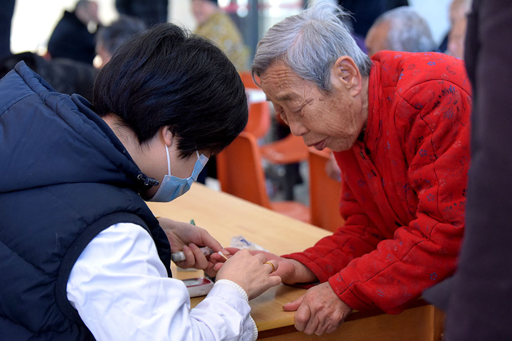 醫(yī)護(hù)人員在給老人測血糖。李金燦 攝